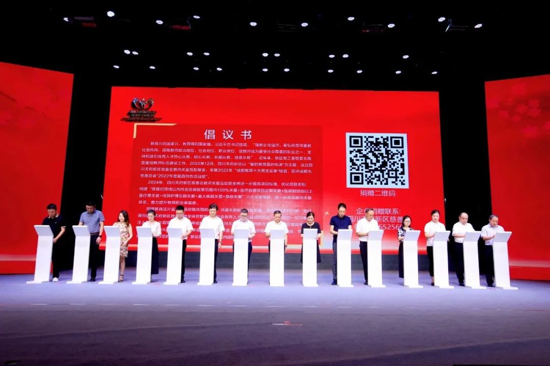 活动现场,2024年教师关爱基金众筹月正式启动。四川天府新区商会会长单位四川启阳汽车集团,常务副会长单位成都华阳建筑股份有限公司、钦成文化旅游集团有限公司,会员单位蔚蓝卡地亚集团等向基金共捐赠140万元,截至活动结束,教师关爱互助基金已募集到资金775万元。