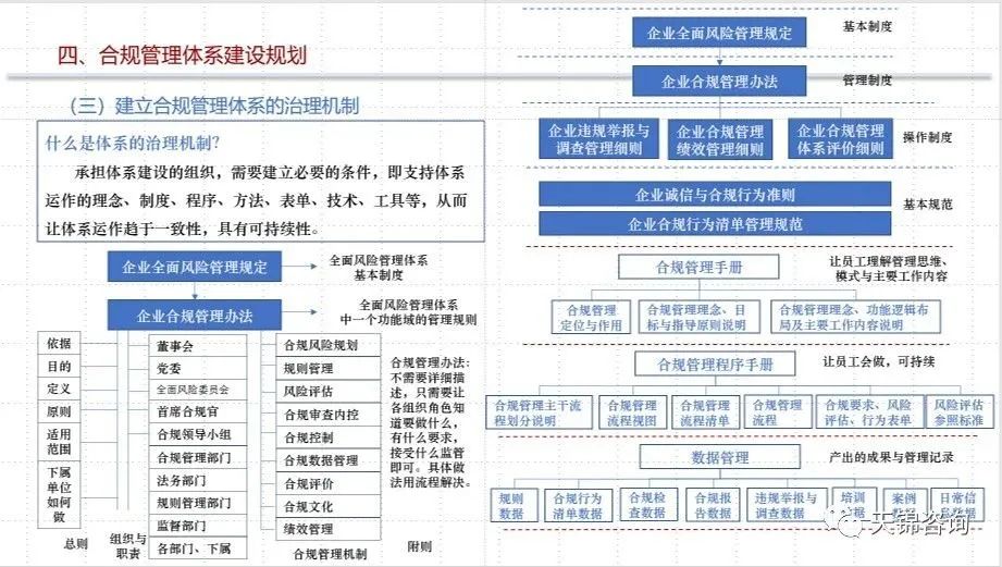 体系内部,还会细分为一些工作或任务。有的工作,也需要建立“管理的法理基础”,才具备做事儿的条件。正如合规管理体系中的违规举报、举报评估、违规线索调查一样,也需要通过制度,构建“法理性”规定,譬如,对举报人的保护政策等等,然后才能谈到“做事儿”。