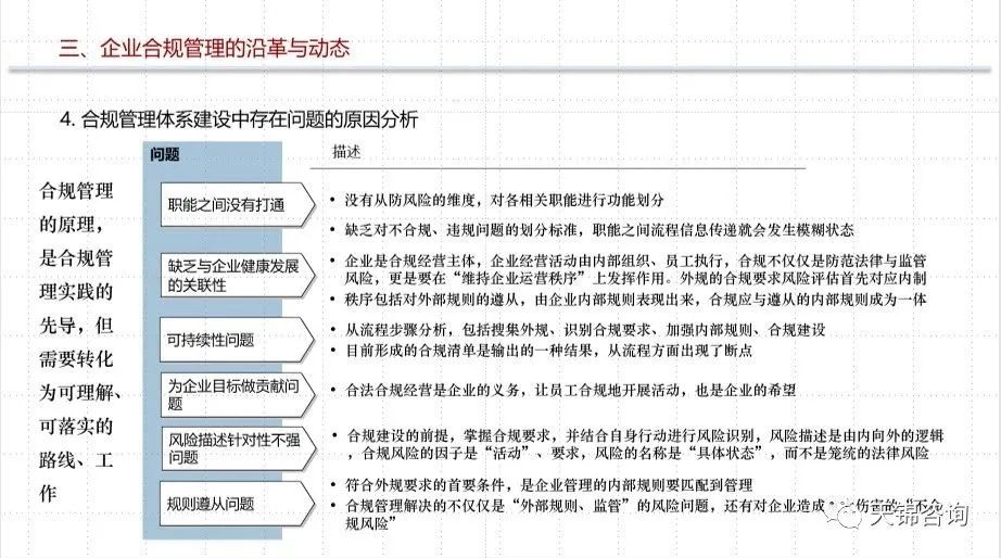 正是有了这个过程,合规风险,才能与企业产品、业务、管理等事项结合起来,形成“可理解、可落实的合规风险与行为清单”。