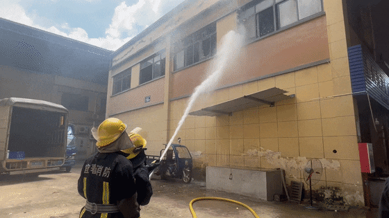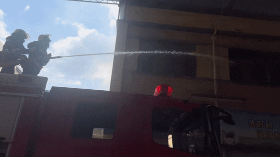 一支水枪向二楼窗口不断洒水