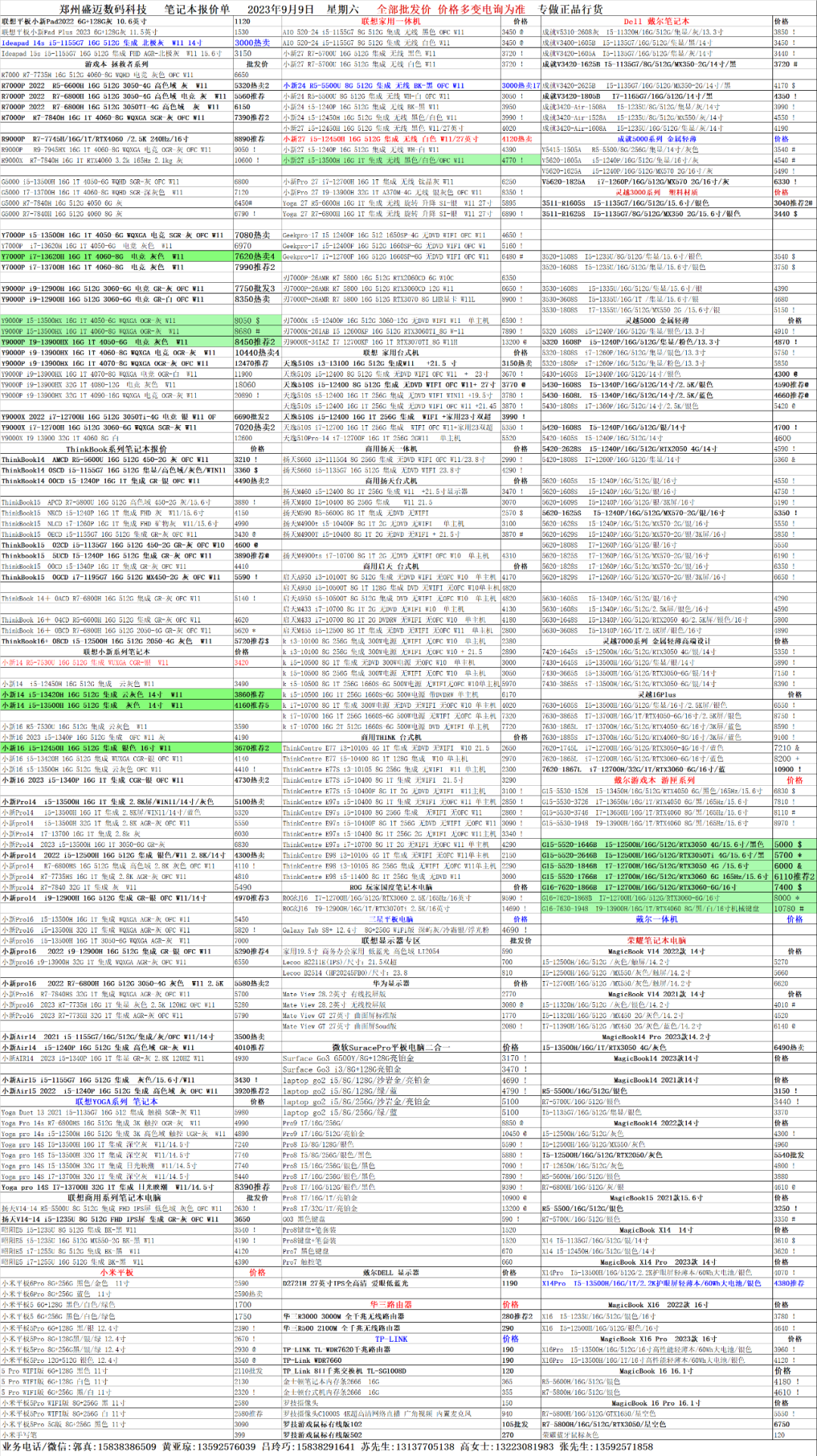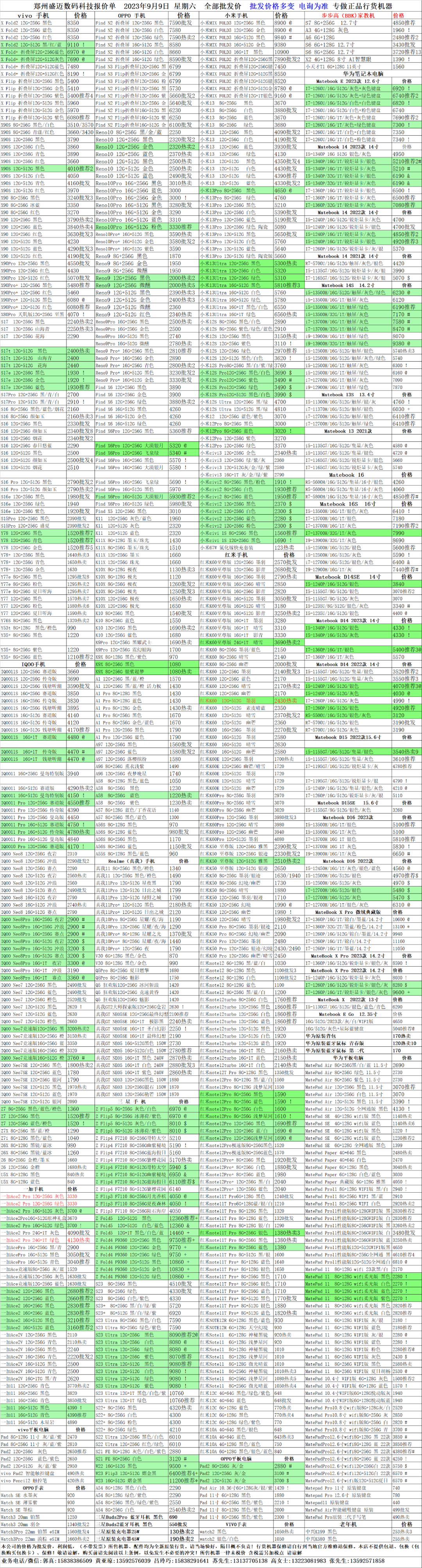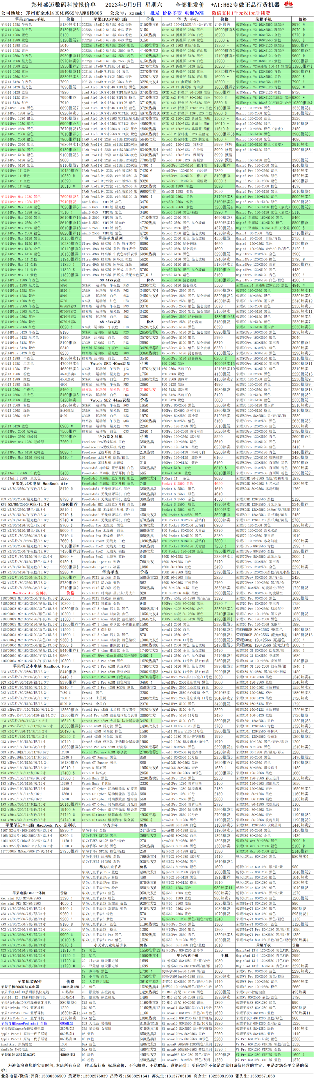 郑州盛迈数码科技2023年9月9日手机/电脑报价