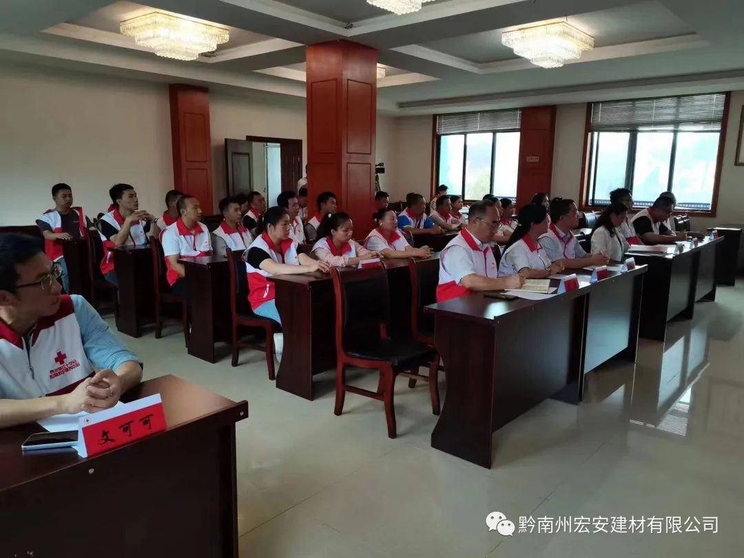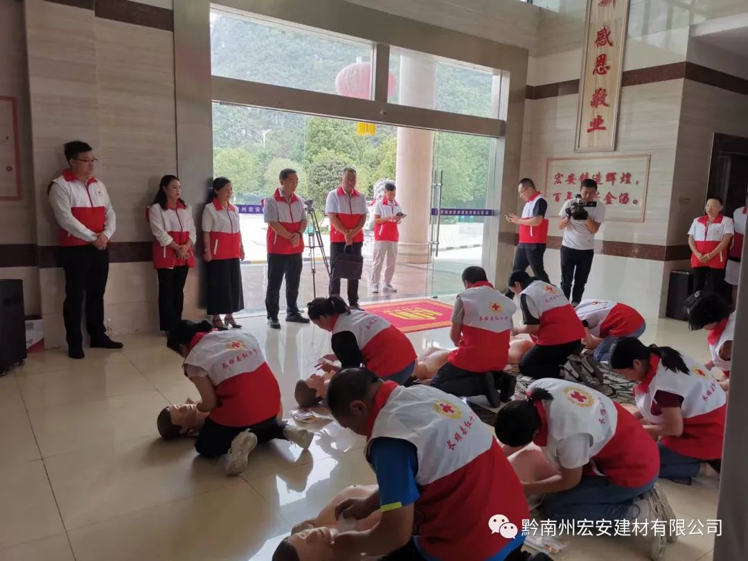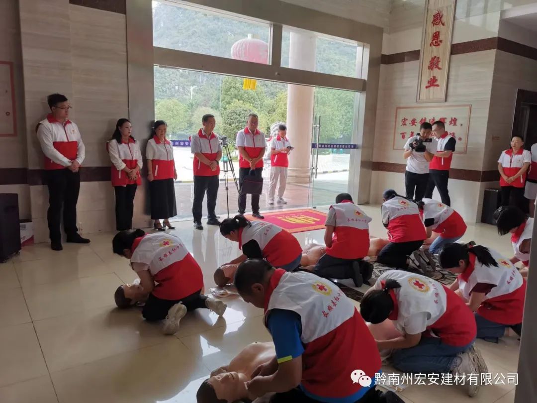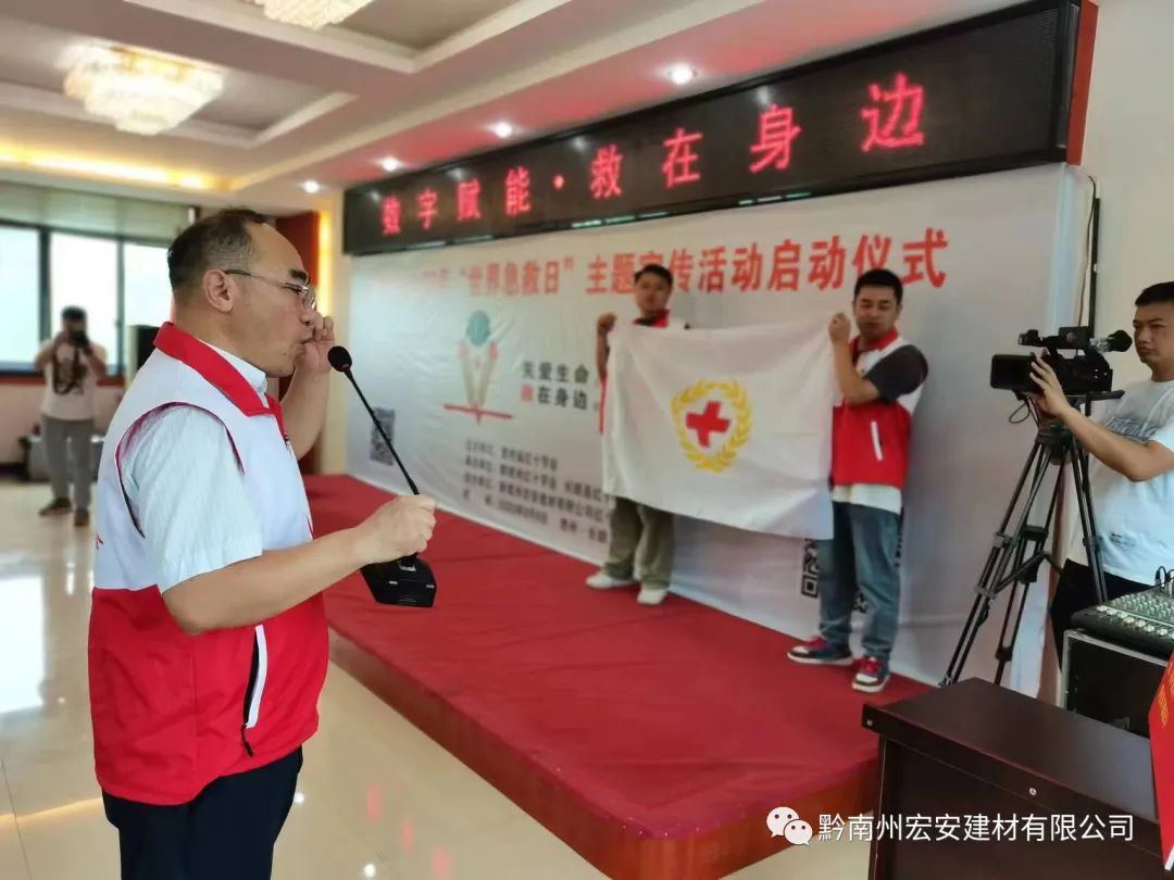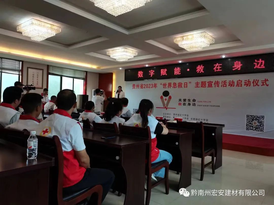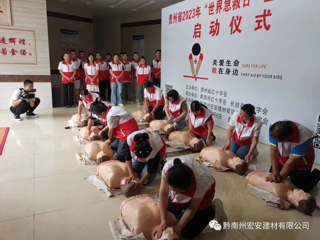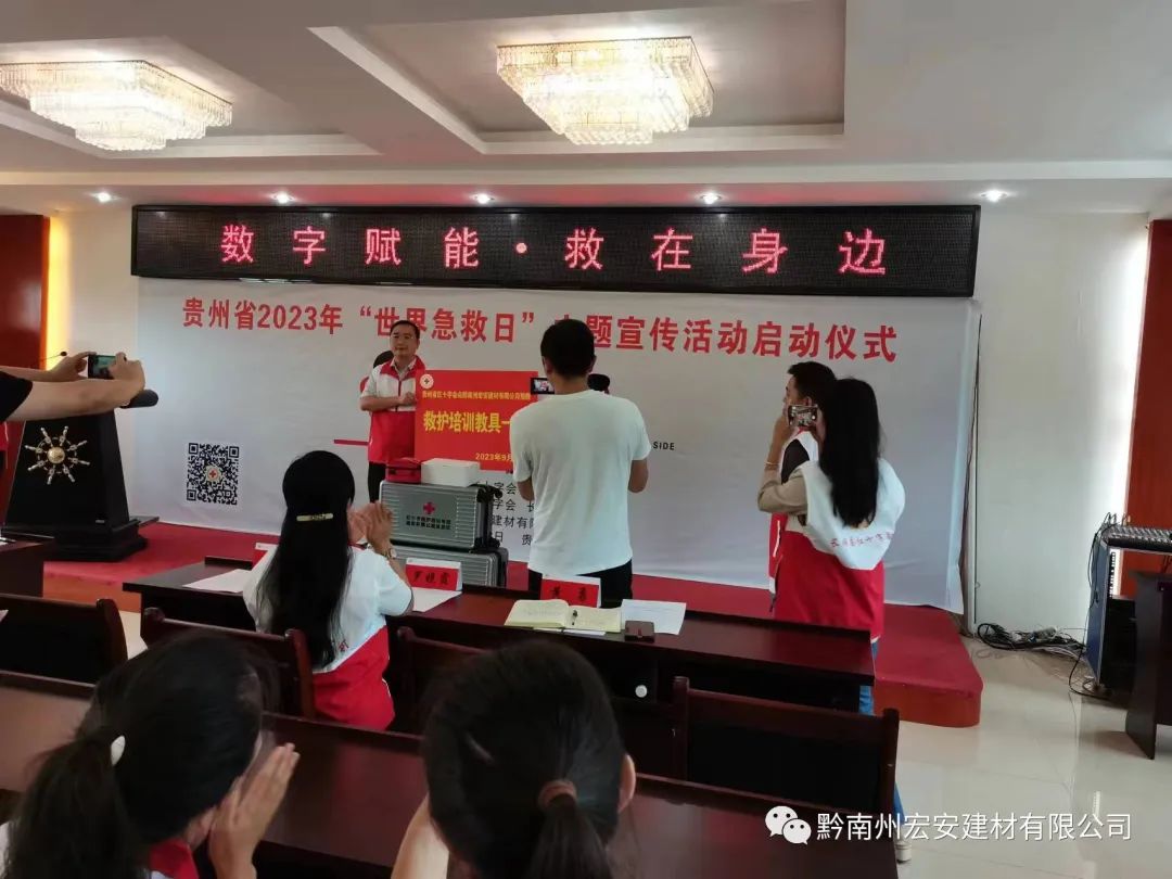2023年9月8日,贵州省2023年“世界急救日”主题宣传启动仪式在长顺宏安公司举行。根据贵州省红十字会关于《贵州省2023年“世界急救日”主题宣传启动仪式活动实施方案》相关要求和安排,通过启动仪式和系列活动开展,宣传和普及应急救护知识和技能,进一步提高职工群众自救、救援救护的意识和水平,逐步达到人人会急救、人人参与急救的目的。仪式由省红十字会主办,州、县红十字会承办,黔南州宏安建材有限公司协办。一、活动签到,参加人员扫码了解中国红十字会“救在身边.应急救护服务平台”。二、长顺县红十字会分管县领导致辞。三、省红十字会领导向宏安公司捐赠救护培训教具。四、省红十字会领导宣布全省“世界急救日”主题宣传活动启动。五、宏安公司红十字会会员代表现场重温红十字会誓词。六、现场观摩成人心肺复苏操作。七、参观宏安公司红十字会工作阵地。八、全体参加活动人员合影留念。仪式由谢扬波秘书长主持。省红十字会领导和专家马艳华,刘劲勇,代欢,文可可等,州红十字会领导罗晓霞,谢扬波等,县人大副主任宋信琼,县红十字会高坤,许强,杨兴兰,姚俊,班明富,罗梦熊,吴壹平等参加活动。宏安公司领导和员工代表黄勇,黄昆,陈冲,周巧巧,吴红卫,李阳和,王金坤,喻占鹏,陈应华,龙继刚,黄铧,陈武,韦壹,毛偲,赵敏等参加活动并接受培训。