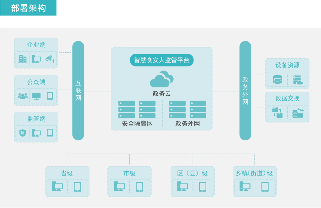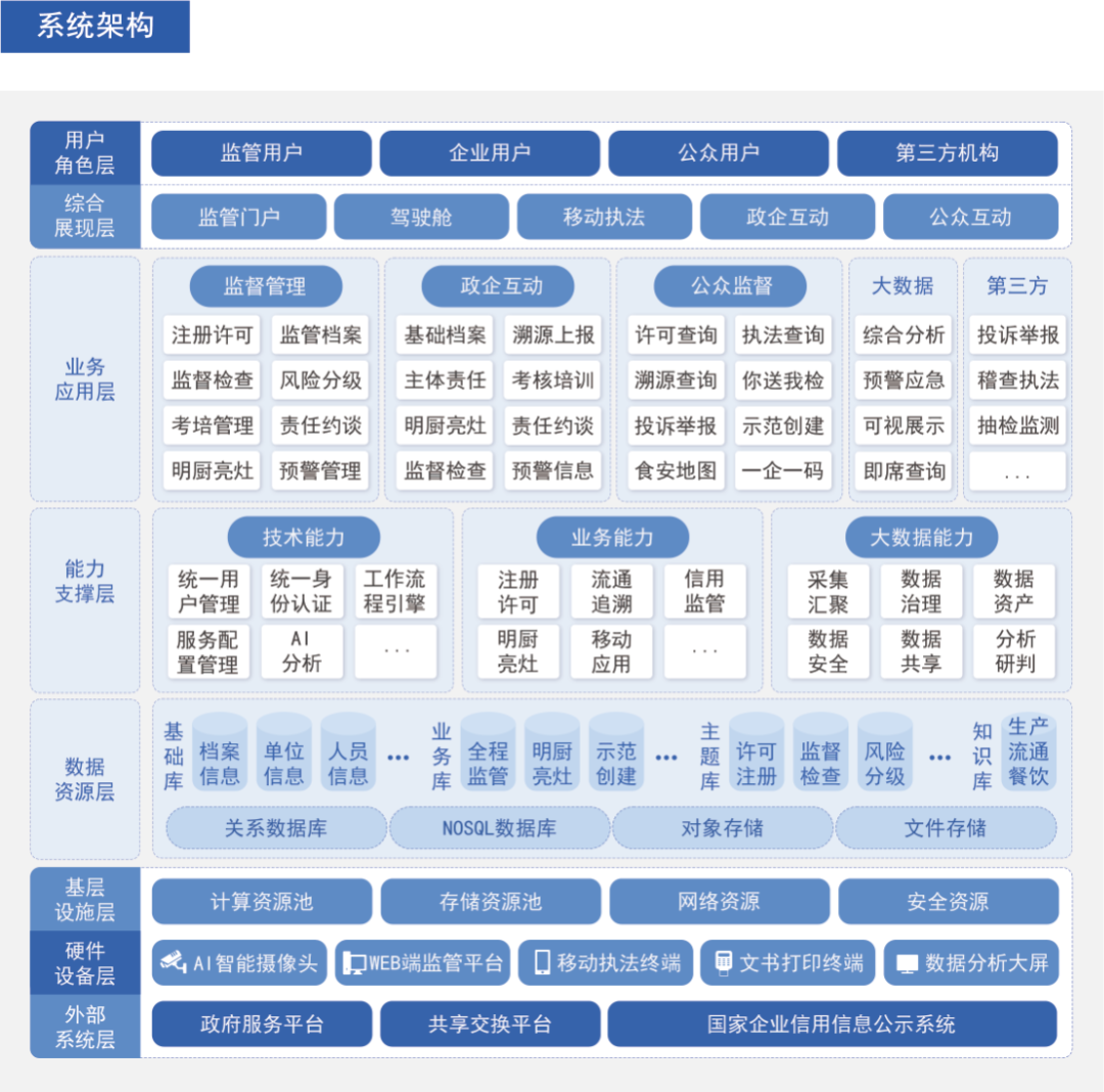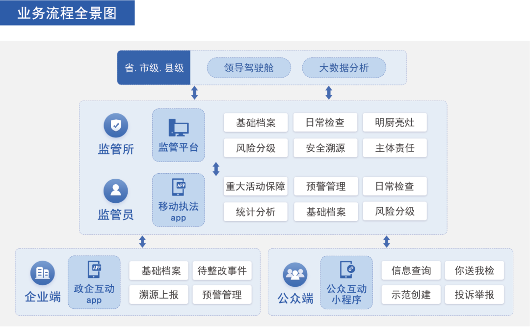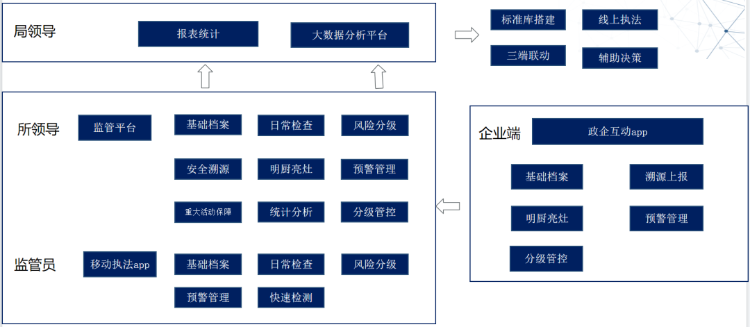 平台建设规划为“4+2+N”暨“一体系”“一张网”“一组库”“一张图”“两中心”“N个应用系统”,从而构建体系创新、业务创新、技术创新的政府、企业、公众三位一体的大监管格局产品功能。