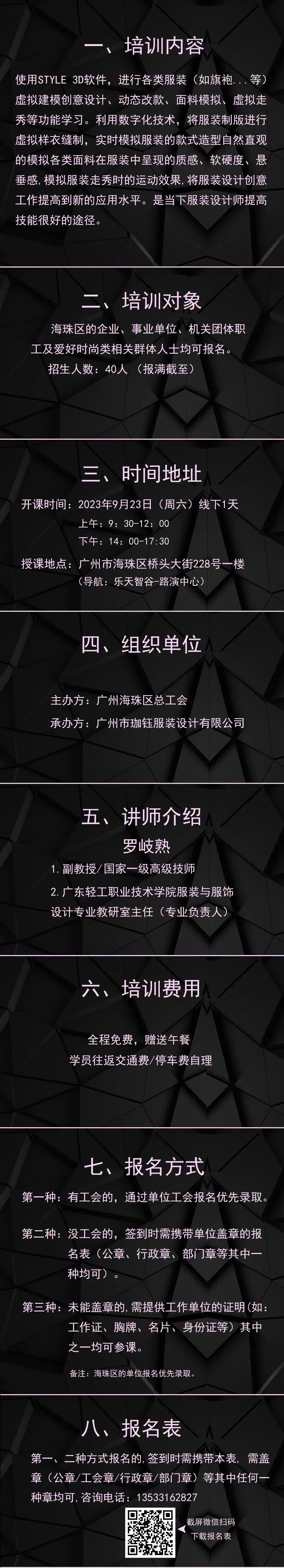 企业、事业单位、机关团体的职工,设计师、设计助理,以及爱好时尚类相关人士均可。需以单位名义报名。不限年龄、学历、职位、单位性质,海珠区的优先录取。