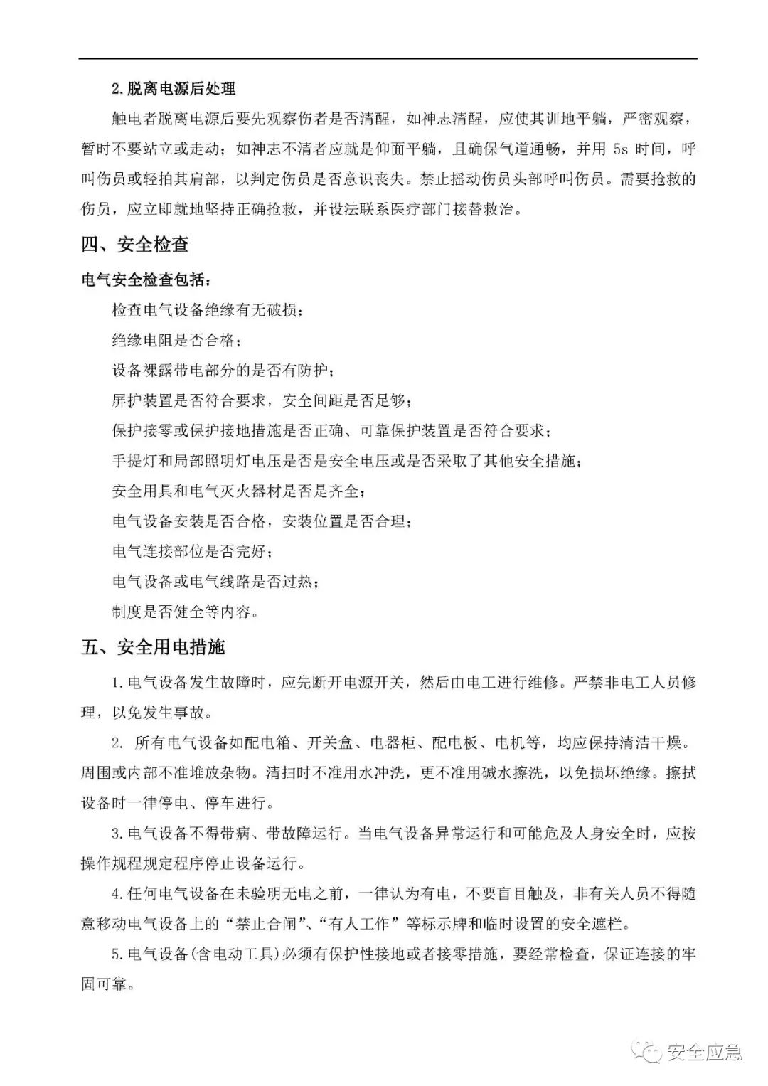 ☞根据土质条件及时调整开挖边坡坡比,将边坡的坡比放缓到稳定状态☞所有用电器具必须经过漏电保护器,而且漏电保护器必须灵敏可靠☞严格按操作规程作业,按时进行机械保养维护、工前检查应到位☞各种防护设施齐全可靠,尤其是发电机传动部分的外防护罩、切割机的手柄开关等☞操作有旋转零部件的设备时严禁戴手套、严禁穿过于肥大的服装☞各种起重设备在安装前必须经检验合格,各种证件齐全。☞起重设备在使用前必须经过专门检查,合格后方准使用。☞起重机操作工、起重指挥人员必须经专门培训后持证上岗。☞钢丝绳、吊带应每班检查,起重机开动前应确认安全后再开车☞脚手架上的杂物应及时清理,所有工器具必须袋装吊运,严禁抛扔,除非有可靠的安全防护措施高处作业:凡在坠落高度基准2m以上有可能坠落的高处进行的作业,均称为高处作业,分为一级高处作业:2-5M;二级, 5-15M ;三级, 15-30M;四级, 30M以上。☞1、首先应做好安全防护设施,比如设置好安全围栏、铺满跳板、挂好安全网等☞2、在上述设施不完善的情况下应系挂安全带,安全带的正确系法应是高挂低用。☞3、身体应满足要求,患有高血压、低血糖、癫痫等不适应症的人员严禁上高架作业。☞严禁明火作业,必须要明火作业时,必须经施工管理部和安全生产部批准,派专人监护,作业完毕立即灭火☞不得在一个垂直面上同时进行电焊气焊作业,氧气瓶、乙炔瓶按规定存储,不得暴晒,两瓶间距保证5M以上,与明火保持10M以上的距离☞焊割作业时下部如有易燃易爆物品,必须采取可靠的防护措施,派专人监护☞如发生火灾,应立即扑救,同时向安全生产部、施工管理部报警(1)要按规定穿戴防护用品。如穿软底鞋、戴安全帽、系安全带;安全带应高挂低用,不能穿皮鞋或塑料硬底鞋作业。(2)登高时禁止使用没有防滑或梯档缺损的梯子。梯顶端应放置牢固或有专人扶梯。(3)登高时用的脚手架要符合规定。使用前要检查是否有断裂伤痕,搁置必质平衡牢靠,两梯要用绳索扎牢。(4)注意脚手架是否坚固、结实、平衡。各层都要放底板篱笆,上下脚架要有良好的扶手,确保安全。(5)高处作业下方必须设安全网。凡无外架防护的施工,必须在4—6米处设一层固定的安全网,每隔12米(四层楼)再设一道固定的安全网,并同时设一道随墙体逐层上升的安全网。(6)在天棚和轻型屋面上操作或行走前,必须在上面搭设跳板或下方满搭安全网。(7)冬季在寒冷地区从事高处作业时,要防止踏冰滑倒,不准在走道、脚手架上倒水。(8)在高处作业遇有雷击或阻云密布将有大雷雨时,脚手架上的作业人员必须立即离开。1、遇到意外伤害时,不要惊慌失措,要保持镇静,并维持好现场的秩序。2、在周围环境不危及生命条件下,一般不要轻易随便搬动伤员。4、如发生意外,而现场无人时,应向周围大声呼救,请求来人帮助或设法联系有关部门,不要单独留下伤病员无人照管。5、立即向有关部门报告事故现场、伤病员人数、伤病情况、伤病处理等。6、根据伤情对病员分类抢救,先重后轻、先急后缓、先近后远。触电急救最重要是动作要迅速。快速、正确地使触电者脱离电源,快速正确地急救。争取时间,就是争取了生命。触电急救现场应用的主要救护方法是人工呼吸法和胸外心脏挤压法。 施行人工呼吸以口对口人工呼吸法效果最好。捏紧触电者鼻孔,深吸一口气后紧贴触电者的口向口内吹气,时间约为2秒钟,吹气完毕后,立即离开触电者的口,并松开触电者的鼻孔,让他自行呼气,时间约3秒钟,每分钟约12次。救护者跪在触电者一侧或骑跪在其腰部两侧,两手相迭,手掌根部放在伤者心窝上方、胸骨下,掌根用力垂直向下挤压,压出心脏里面的血液,挤压后迅速松开,胸部自动复原,血液充满心脏,以每分钟60次速度进行。一旦呼吸和心脏跳动都停止了,应当同时进行口对口人工呼吸和胸外挤压,如现场仅一人抢救,可以两种方法交替使用,每吹气2—3次,再挤压10—15次。抢救要坚持不断,切不可轻率终止,运送途中也不能终止抢救。中暑后会出现头晕、头痛、全身无力、口渴、心悸、恶心、呕吐等症状,严重时会突然晕倒。中暑又可分为先兆中暑、轻症中暑及重症中暑。让中暑病人立即离开高温环境,转移到阴凉通风处休息,并解开衣服,呈平卧姿势,同时让患者多喝含盐饮料。对于先兆中暑者,可不进行特殊治疗,让他自然恢复正常。对于重症中暑病人,要立即送医院抢救治疗。1.立即挖出伤员,注意不要再度受伤,动作要轻,准、快,不要强行拉。如全部被埋应尽快将伤者的头部优先暴露出来,清理口鼻泥土砂石、血块,松解衣带,以利呼吸。3.伤口出血时应用布条止血和净水冲洗伤口,用干净毛巾包扎好以防感染。7.搬运伤员要平稳,避免颠簸和扭曲。有条件时及早输血、输液。2、在搬运和转送过程中,颈部和躯干不能前屈或扭转,而应使脊柱伸直,绝对禁止一个抬肩一个抬腿的搬法,以免发生或加重截瘫。3、创伤局部妥善包扎,但对疑颅底骨折和脑脊液漏患者切忌作填塞,以免导致颅内感染。4、颌面部伤员首先应保持呼吸道畅通,松解伤员的颈、胸部钮扣。5、复合伤要求平仰卧位,保持呼吸道畅通,解开衣领扣。6、周围血管伤,压迫伤部以上动脉干至骨骼。直接在伤口上放置厚敷料,绷带加压包扎以不出血和不影响肢体血循环为宜,常有效。新到一