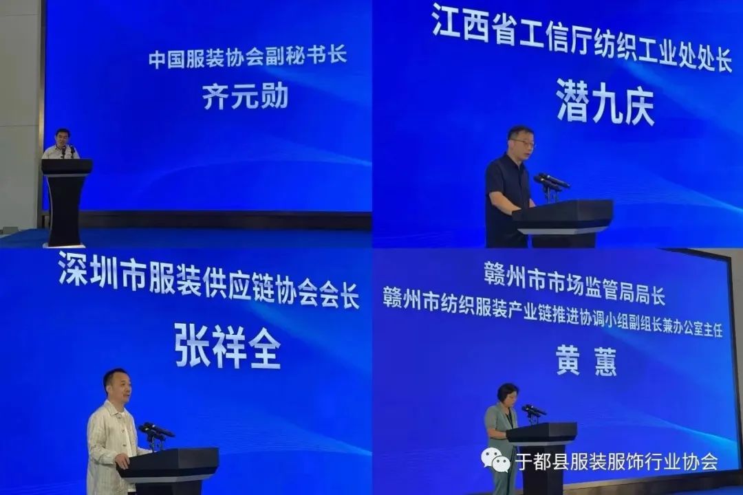 协会成立大会上,中国服装协会、江西省工信厅、深圳市服装供应链协会先后致贺词,市纺织服装产业办、会长单位法人代表致辞。窦良坦、柯岩松为协会揭牌,会上还为会长企业、荣誉会长企业、监事长企业授牌。