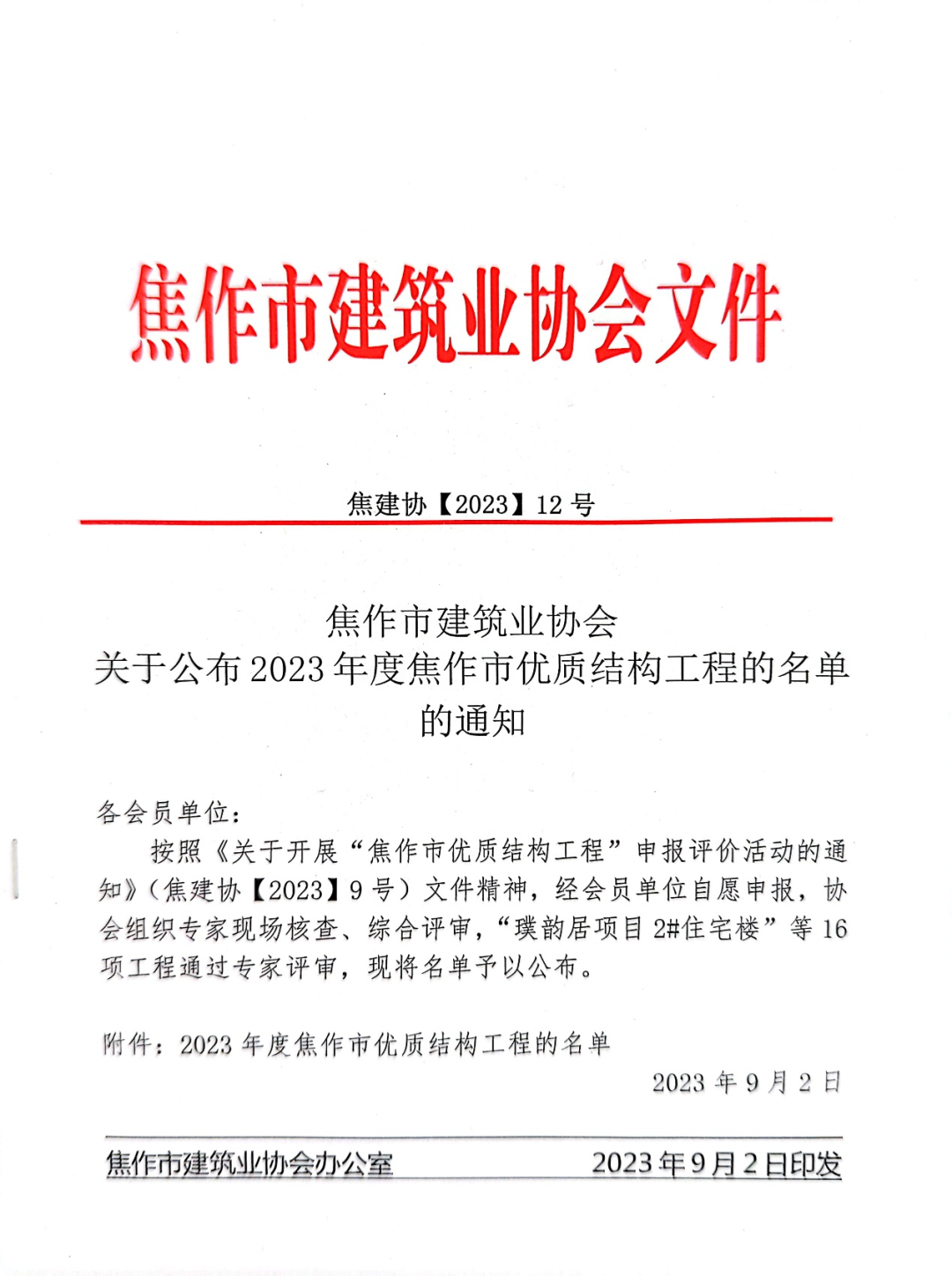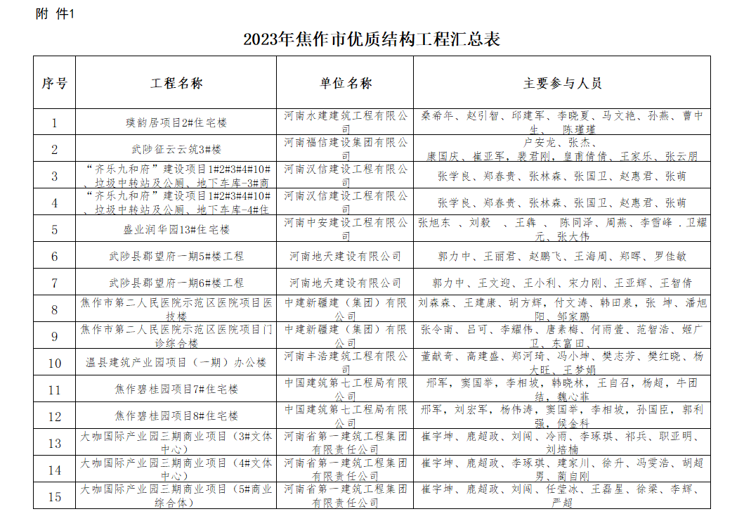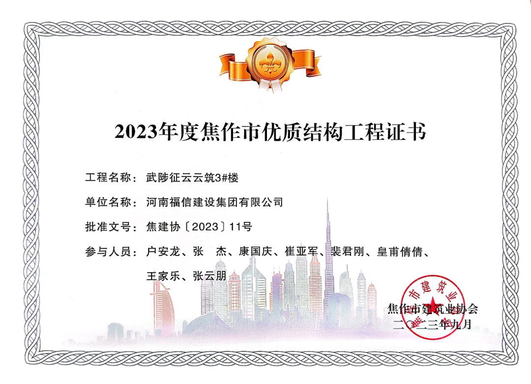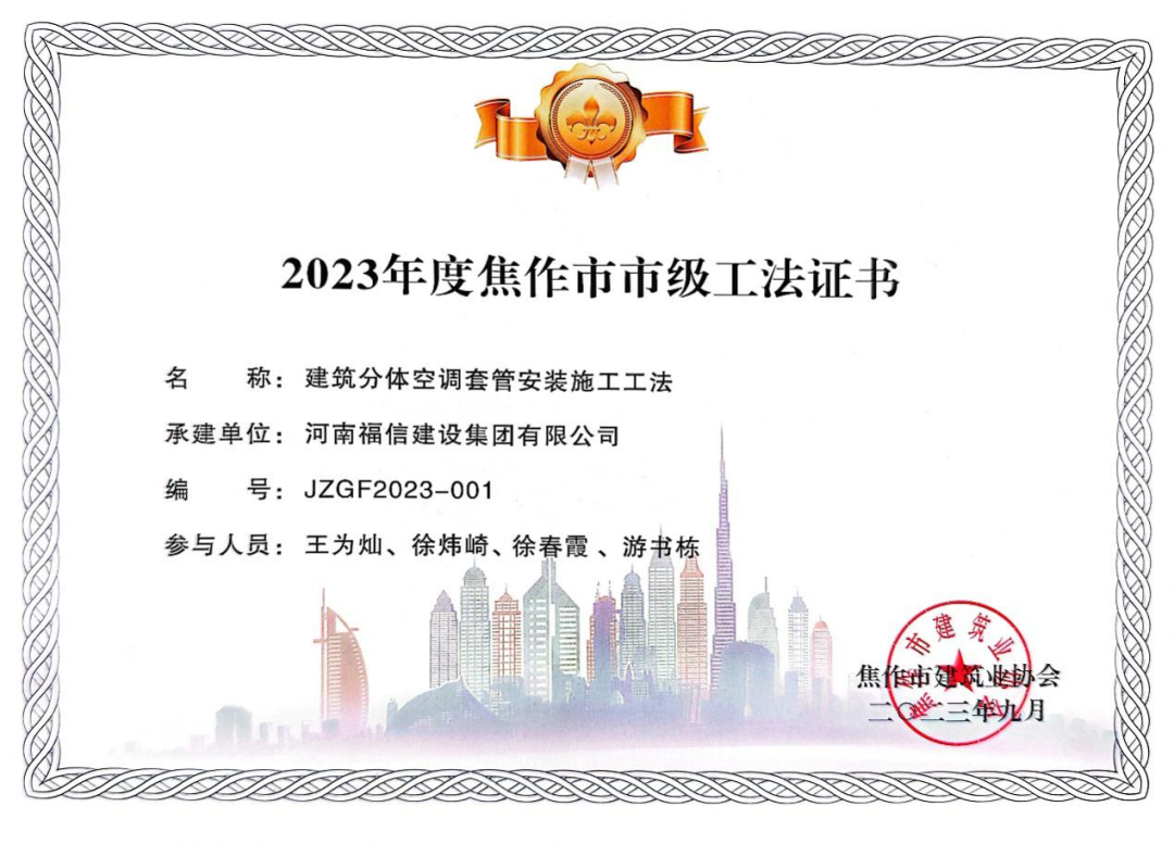 近日,焦作市建筑业协会发布了2023年度焦作市优质结构工程和2023年度焦作市市级工法成果名单,由河南福信建设集团有限公司承建的(武陟)征云云筑3#楼项目被评为“焦作市优质结构工程”。同时河南福信建设集团有限公司分别荣获” 建筑分体空调套管安装施工工法“、“填充墙弱电箱一次成型预制构件安装施工工法”。