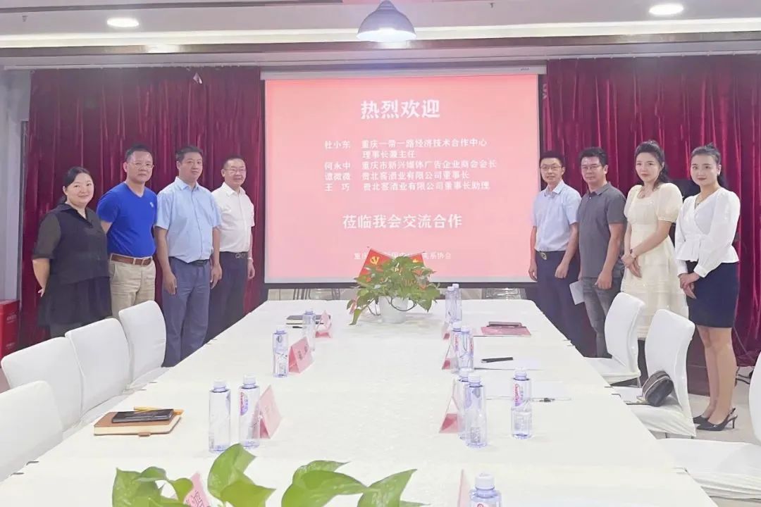 9月7日,重庆一带一路经济技术合作中心理事长兼主任杜小东,重庆市新兴媒体广告企业商会会长何永中,贵北窖酒业有限公司谭微微,贵北窖酒业有限公司谭董事长助理王巧等莅临重庆市国际国内公共关系协会,对接洽谈(2023)重庆两江会长论坛合作事宜。重庆市国际国内公共关系协会会长陈伟,重庆市国际国内公共关系协会副会长李立力,重庆市国际国内公共关系协会秘书长程凌,重庆市国际国内公共关系协会主任任欢等出席活动。