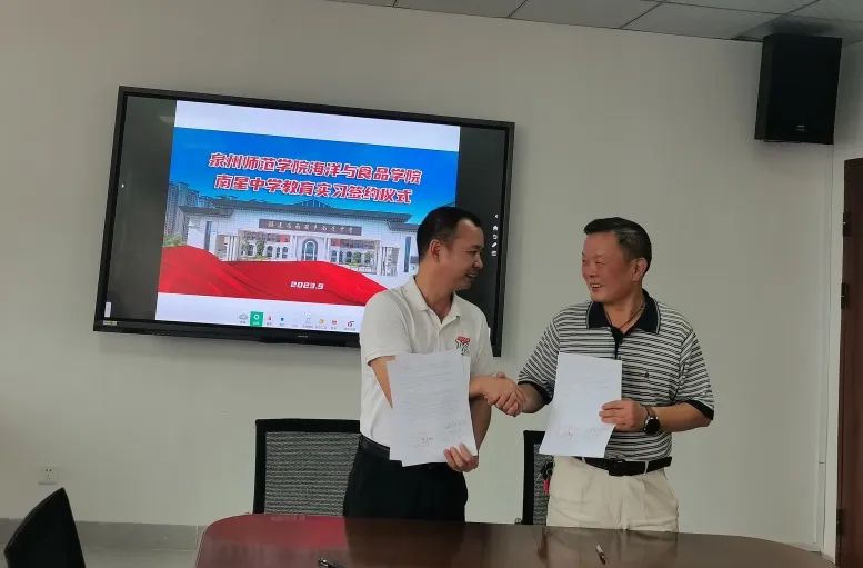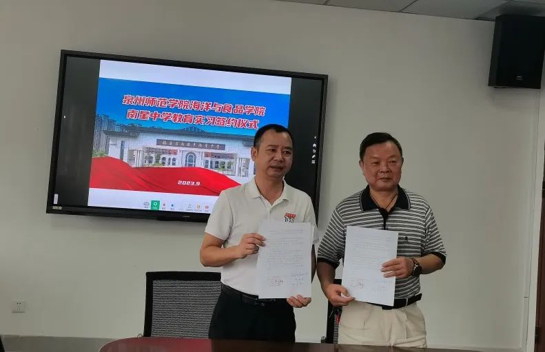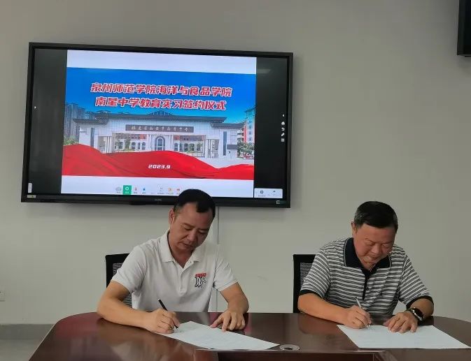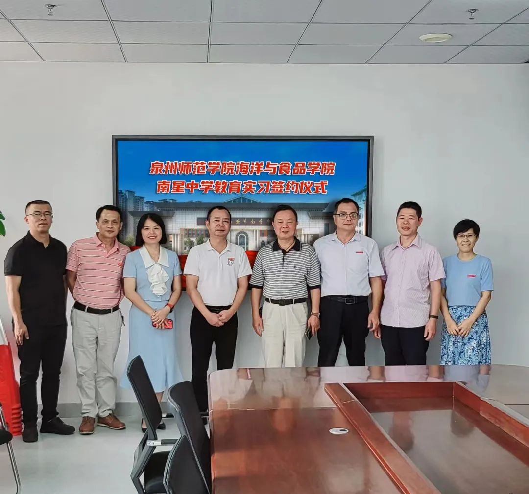 白露辞盛暑,丹桂沁秋光。为探索育人模式,搭建教育实践平台,推进教师队伍专业成长,2023年9月8日泉州师范学院海洋与食品学院与南安市南星中学就教育实习共建举行签约仪式。仪式在南星中学滨海校区办公楼举行。出席仪式的有泉州师院海洋与食品学院院长袁建军、书记蔡志荣、副院长郑宗平、系主任陈细香和南星中学党总支书记、校长黄新生、副校长周龙拿、办公室主任吴国盛、总务处副主任苏亚明、教务处副主任王档良。
