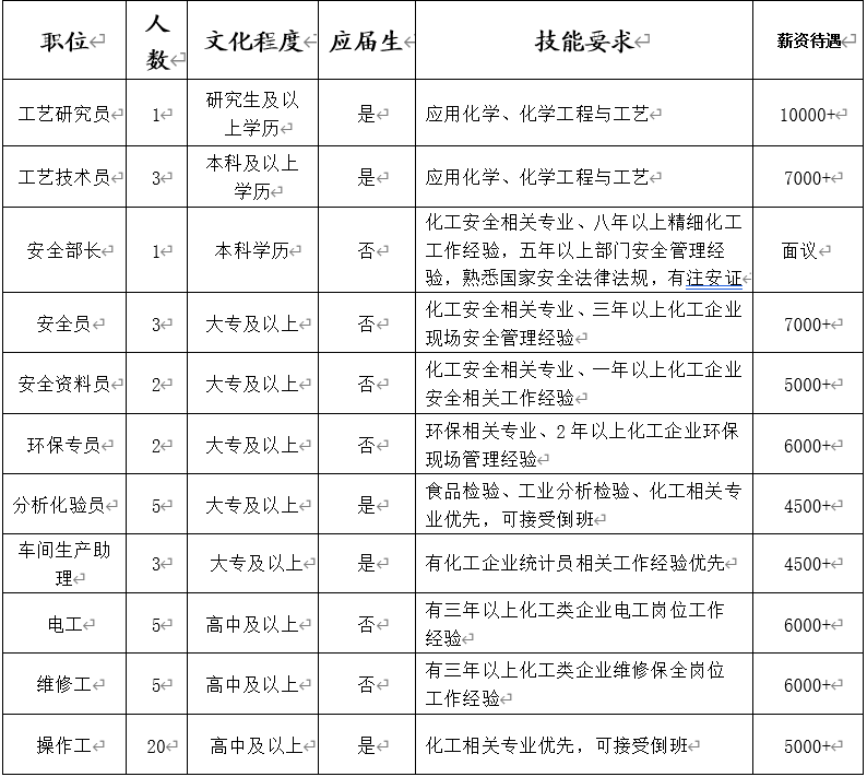 任职要求:年龄25-45岁,中专及以上学历,有化工操作岗位经验者优先,能接受倒班。