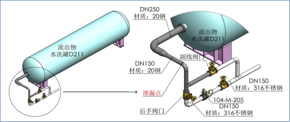 事故管道变更。由于水洗罐尺寸发生变更,水洗罐口径变粗(D273x7mm ),致使原先预制的316奥氏体不锈钢管材 (D168x7mm)不能满足安装需要,但订购符合条件的管道需要较长时间。为抢赶工期,在未经设计变更的情况下,浩业化工现场负责人同意中化十四建施工负责人提出的更换管道材质的建议,擅自决定将水洗混合器后手阀门和水洗混合器副线阀门至水洗罐段的管道(长度约11.2米)材质由316奥氏体不锈钢更换为20#钢。即下图中所示深色管道部分。