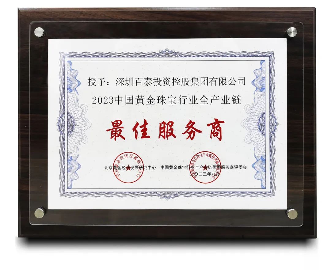 2023中国黄金珠宝行业全产业链优秀服务商和最佳服务商、中国金店100强在盛典现场进行了授牌,百泰集团被授予“2023中国黄金珠宝行业全产业链最佳服务商”。