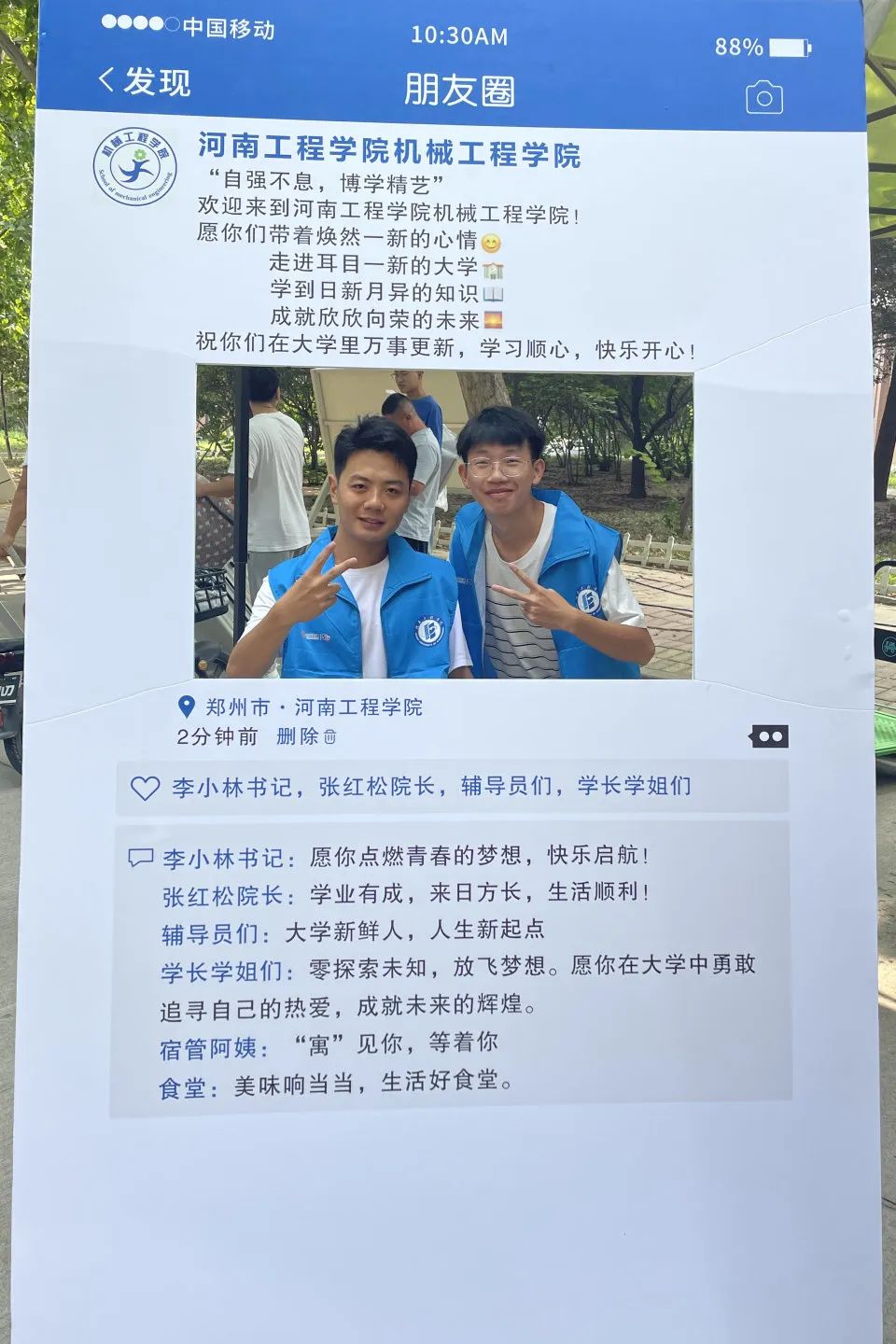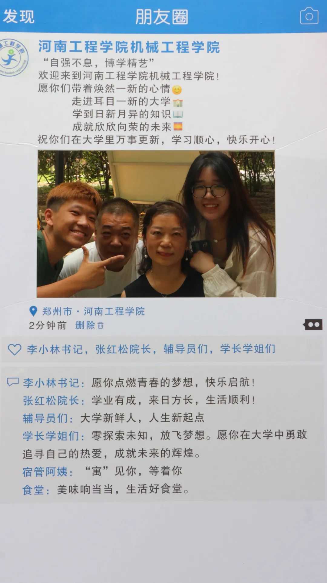 当金钟鸣响,当朝霞放光,当五彩照耀,当礼炮轰鸣,当祝贺溢耳,当短信到来,当开始新的大学生活的时候,请带上机械工程学院全体师生衷心的祝福,愿:学业有成,前程似锦。