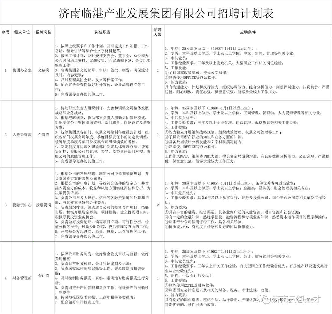 本次招聘主要面向社会招聘,共发布需求岗位4个,计划招聘5人,岗位工作地点均为济南市。具体岗位及要求详见 《济南临港产业发展集团有限公司招聘计划表》(附件)。