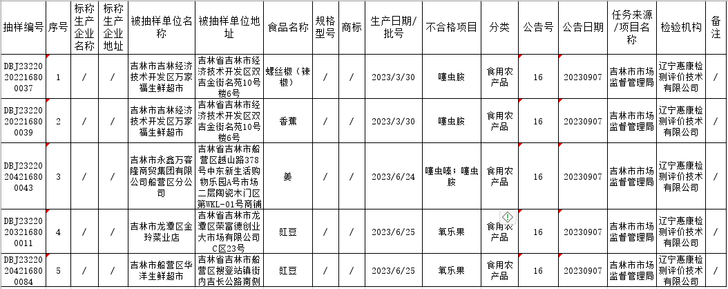 近期,吉林市市场监督管理局抽检食用农产品100批次样品,不合格样品5批次。检测项目见附件。具体情况如下: