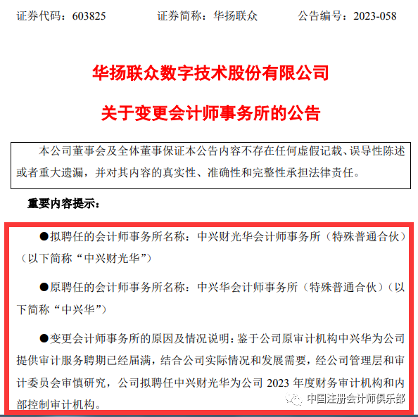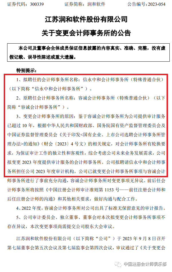 华扬联众于9月9日发布的《关于变更会计师事务所的公告》显示,鉴于公司原审计机构中兴华为公司提供审计服务聘期已经届满,结合公司实际情况和发展需要,经公司管理层和审计委员会审慎研究,公司拟聘任中兴财光华为公司2023年度财务审计机构和内部控制审计机构。根据公司2022年年度报告披露,该公司已与中兴华会计师事务所(特殊普通合伙)合作1年。2022年度支付中兴华280万元的审计费用。润和软件于9月9日发布的《关于变更会计师事务所的公告》显示,鉴于容诚会计师事务所为公司提供审计服务已超过10年,根据中华人民共和国财政部、国务院国有资产监督管理委员会及中国证券监督管理委员会《关于印发<国有企业、上市公司选聘会计师事务所管理办法>的通知》(财会〔2023〕4号文)的相关规定,对会计师事务所有轮换要求,为保证审计工作的独立性和客观性,综合考虑公司未来业务发展需求,公司拟变更2023年度提供审计服务的会计师事务所。公司拟聘请信永中和会计师事务所担任公司2023年度审计机构。2023年度,信永中和会计师事务所拟收取的审计费用共计150万元。根据公司2022年年度报告披露,该公司已与容诚会计师事务所合作12年。2022年度支付容诚150万元的审计费用。