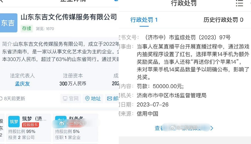 祁天道控股山东公司因在某平台设置抽奖,未对奖品数量明确公布,影响了兑奖,被行政相关部门处罚了5万元!