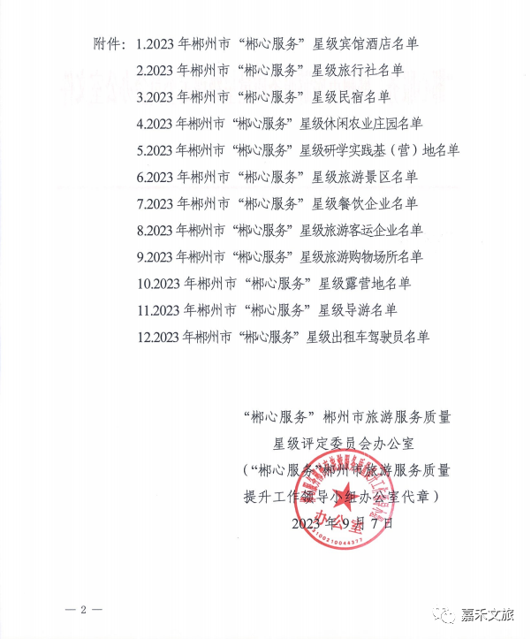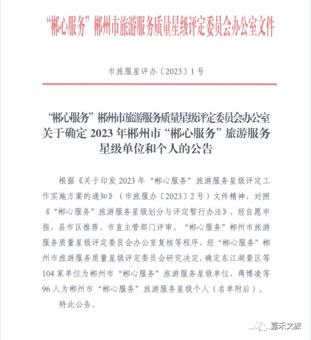 2023年9月7日,“郴心服务”郴州市旅游服务质量星级评定委员会办公室印发《关于确定2023年郴州市‘郴心服务’旅游服务星级单位和个人的公告》(市旅服星评办〔2023〕1号)如下: