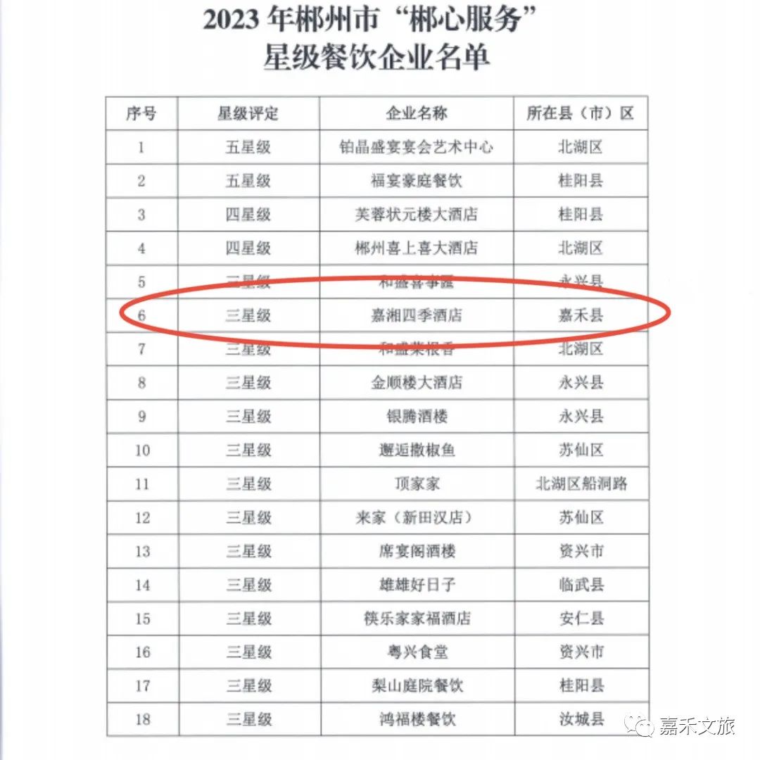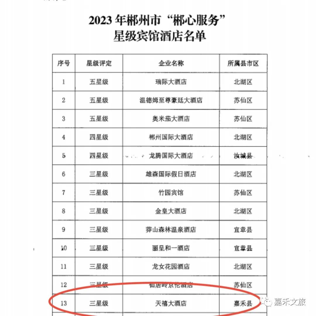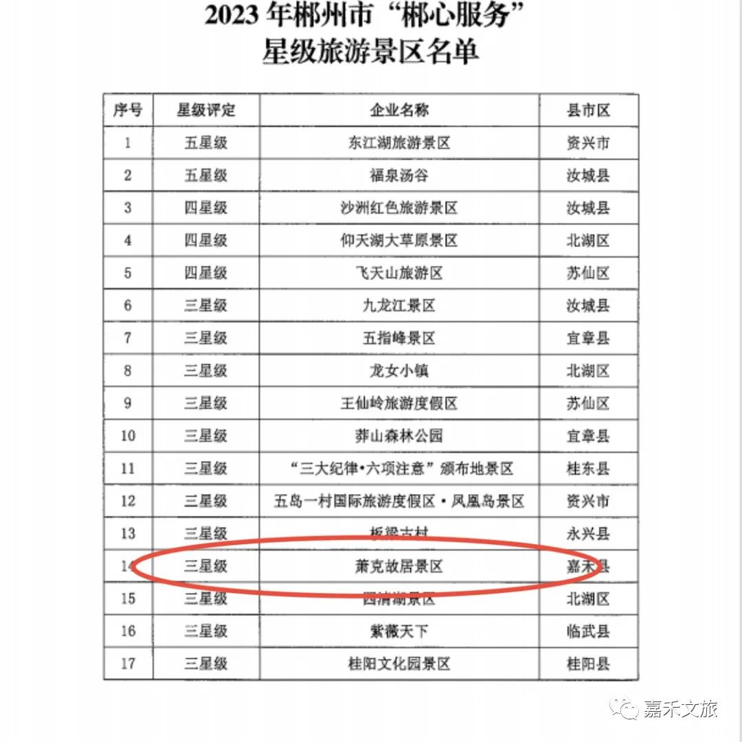我县六处旅游服务企业被评定为“郴心服务”旅游服务星级单位,其中天禧大酒店被评定为“郴心服务”三星级宾馆酒店;三汇农庄、观音山农庄被评定为“郴心服务”四星级休闲农庄;三汇研学基地被评定为“郴心服务”四星级研学实践基(营)地;萧克故居景区被评定为“郴心服务”三星级旅游景区;嘉湘四季酒店被评定为“郴心服务”三星级餐饮企业。