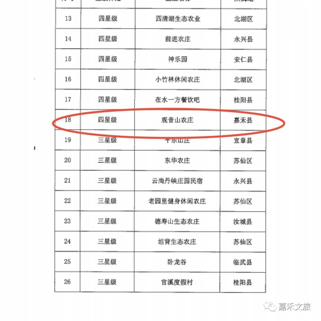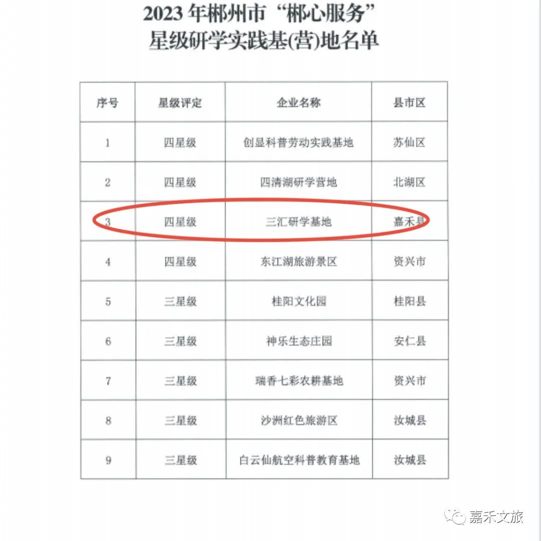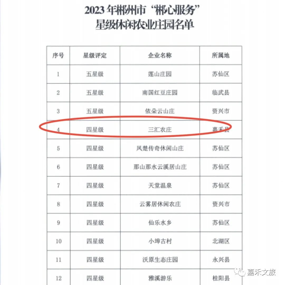 我县六处旅游服务企业被评定为“郴心服务”旅游服务星级单位,其中天禧大酒店被评定为“郴心服务”三星级宾馆酒店;三汇农庄、观音山农庄被评定为“郴心服务”四星级休闲农庄;三汇研学基地被评定为“郴心服务”四星级研学实践基(营)地;萧克故居景区被评定为“郴心服务”三星级旅游景区;嘉湘四季酒店被评定为“郴心服务”三星级餐饮企业。