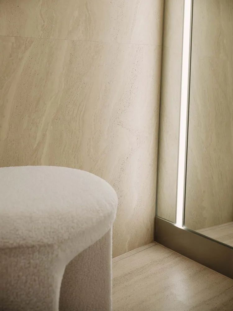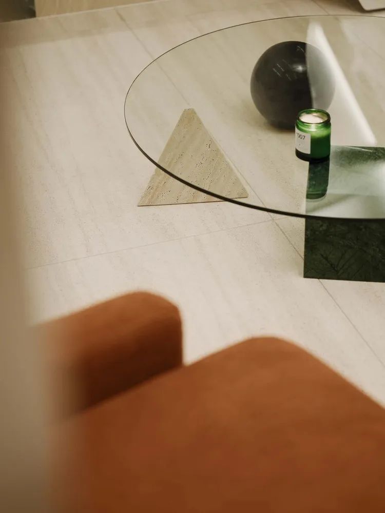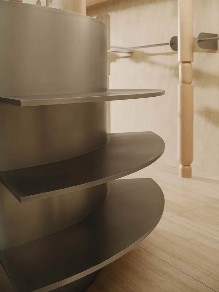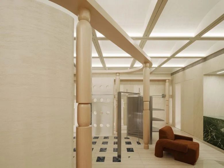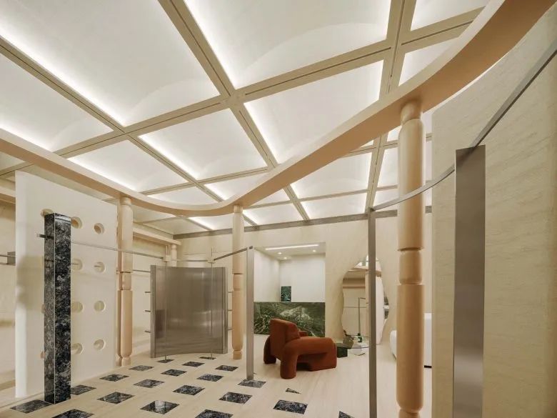 墙面材料——黄色石灰华,与店铺立面和收银员使用的绿松石形成鲜明对比,点缀着深浅的白色语境,诠释着青山与山石的亲密关系,展现出自然之美和含蓄的奢华优雅。柔和的调色板充满了大量的浅色木材和柔和的棕色,提供了宁静和最小的氛围。这些颜色相辅相成,使空间看起来更宽敞、更干净、更整洁。青铜沙发和绿松石从整体的木色方案中凸显出来,赋予空间积极的氛围,并精心营造出精致优雅的气息。