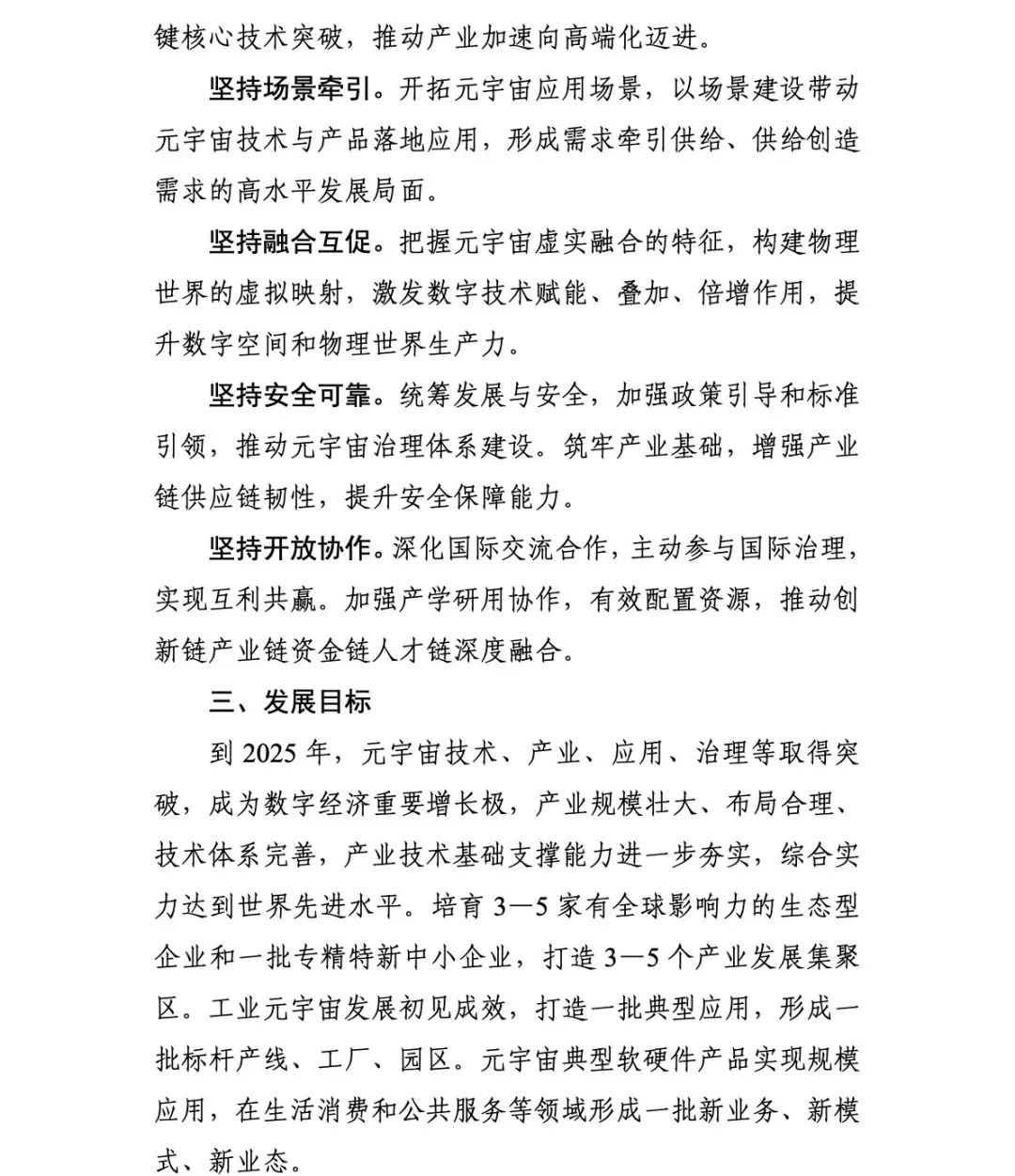 的发展目标是到2025年,元宇宙技术、产业、应用、治理等取得突破,成为数字经济重要增长极,产业规模壮大、布局合理、技术体系完善,产业技术基础支撑能力进一步夯实,综合实力达到世界先进水平。培育3-5家有全球影响力的生态型企业和一批专精特新中小企业,打造3-5个产业发展集聚区。工业元宇宙发展初见成效,打造一批典型应用,形成一批标杆产线、工厂、园区。元宇宙典型软硬件产品实现规模应用,在生活消费和公共服务等领域形成一批新业务、新模式、新业态。