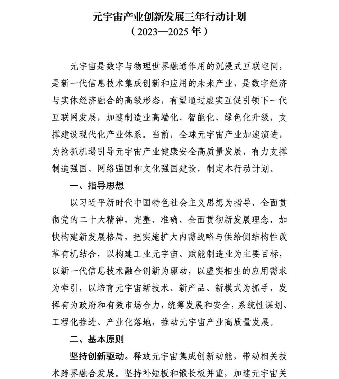 整份文件的基本原则在于坚持创新驱动,补短板和锻长板并重,加速元宇宙关键技术攻关,推动元宇宙产业融合发展并加强安全可信的产业治理。通过构建工业元宇宙、赋能制造业为主要目标,以新一代信息技术融合创新为驱动,以虚实相生的应用需求为牵引,以培育元宇宙新技术、新产品、新模式为抓手,推动元宇宙产业高质量发展。