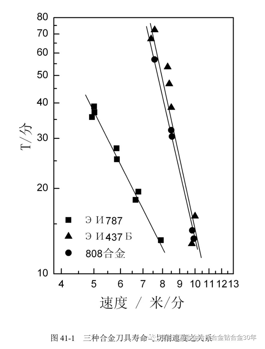 材料的切削加工性,就是对材料进行切削加工的难易程度。材料的加工性不仅和材料本身有关,而且随加工条件、加工要求等不同而异,因此,材料的加工性是一个相对的概念。衡量材料切削加工性的指标,一般认为有以下四个方面:刀具耐用度的大小,即在保证相同的刀具耐用度前提下,切削某种材料所允许的切削速度值;加工表面质量的优劣;切削力或切削功率的大小;材料的断屑性能[13961767712]。材料切削加工性的概念,仅适用于两种或几种材料之间的相互比较。GH2135合金是g¢相沉淀强化高温合金,可以制作航空发动机涡轮盘、涡轮叶片和燃气轮机火焰筒,制作涡轮叶片,需要进行断续切削。为了和镍基合金ЭИ437Б及铁基合金ЭИ787进行比较,开展了切削加工对比试验。为了模拟叶片切削加工状况,在园棒半径处开-90℃凹槽,造成断续切削条件,使用W18Cr4V高速钢刀具,在相同条件下,三种合金的刀具寿命与切削速度的关系见图41-1。可见GH2135合金切削加工性和ЭИ437Б相近,较ЭИ787合金容易加工。若保持刀具寿命相同,与ЭИ787合金比较,切削速度可提高70%左右。生产上都用相对加工性KV来衡量[13961767712]。