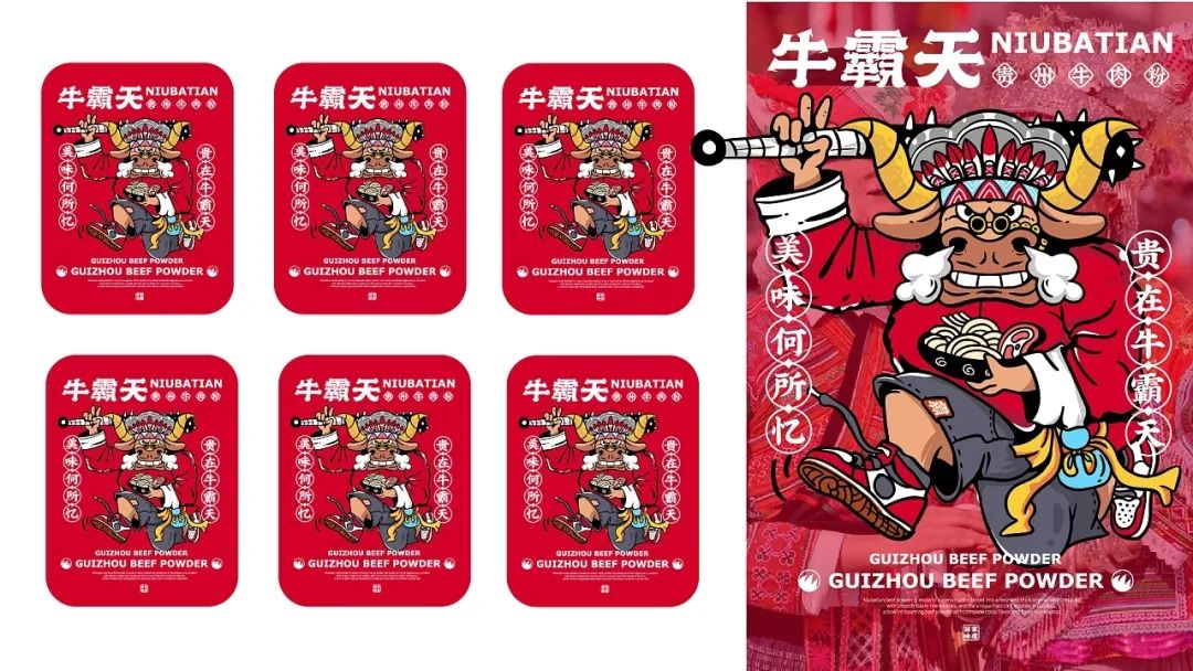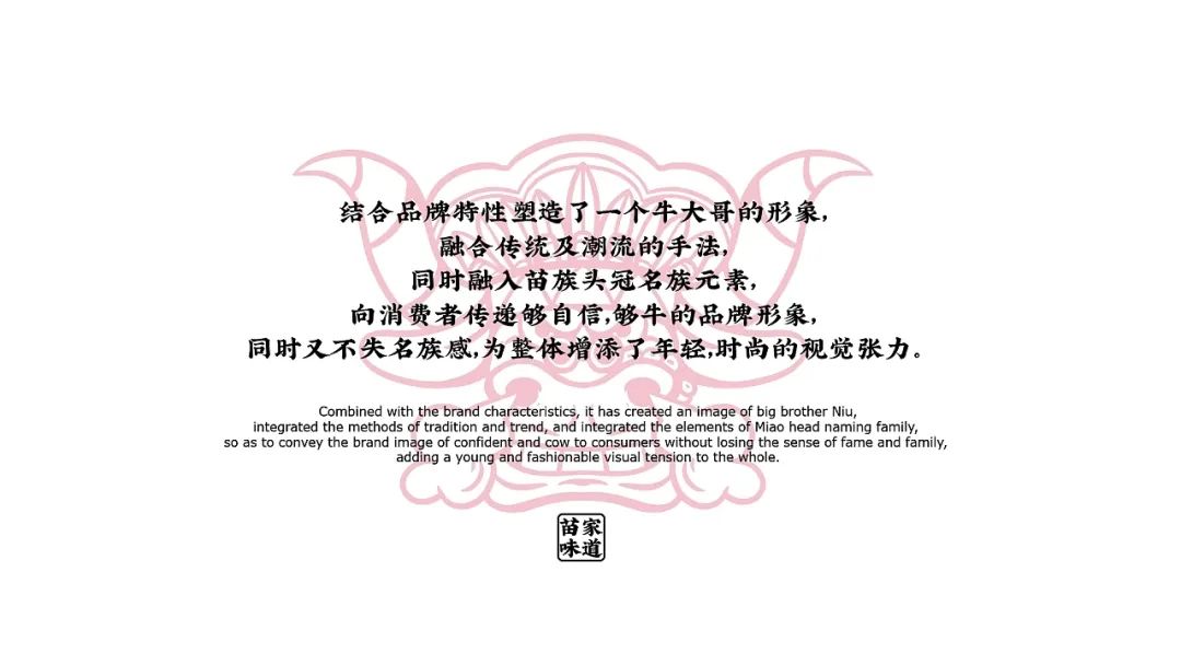 结合品牌特性塑造了一个牛大哥的形象,融合传统及潮流的手法,同时融入苗族头冠名族元素,向消费者传递够自信,够牛的品牌形象,同时又不失名族威,为整体增添了年轻,时尚的视觉张力