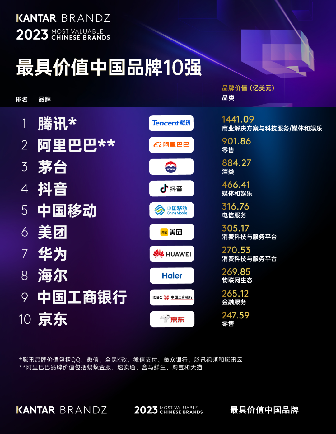 腾讯(1441.09亿美元)连续第三年位居榜首,这主要得益于腾讯以“扎根消费互联网、拥抱产业互联网,推动可持续社会价值创新”作为公司发展的新底座,牵引所有核心业务,从而为用户、为产业,最终为社会持续创造价值。阿里巴巴(第二名,901.86亿美元)、茅台(第三名,884.27亿美元)和抖音(第四名,466.41亿美元)稳步保持2022年的势头。中国移动(第五名,316.76亿美元)自2019年后首次冲入榜单前五,凭借其多元化的业务服务以及对5G、云服务等新技术基础设施的投入,实现品牌价值38%的强势增长。榜单中唯一的物联网生态品牌海尔(第八名,269.85亿美元),聚焦智慧住居和产业互联网两大主赛道,持续与C端用户和B端客户共创新生态、新体验、新价值,品牌排名稳步提升。最具价值中国品牌10强
