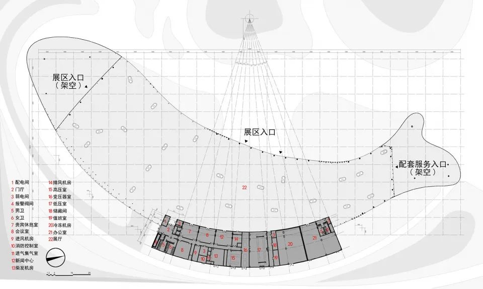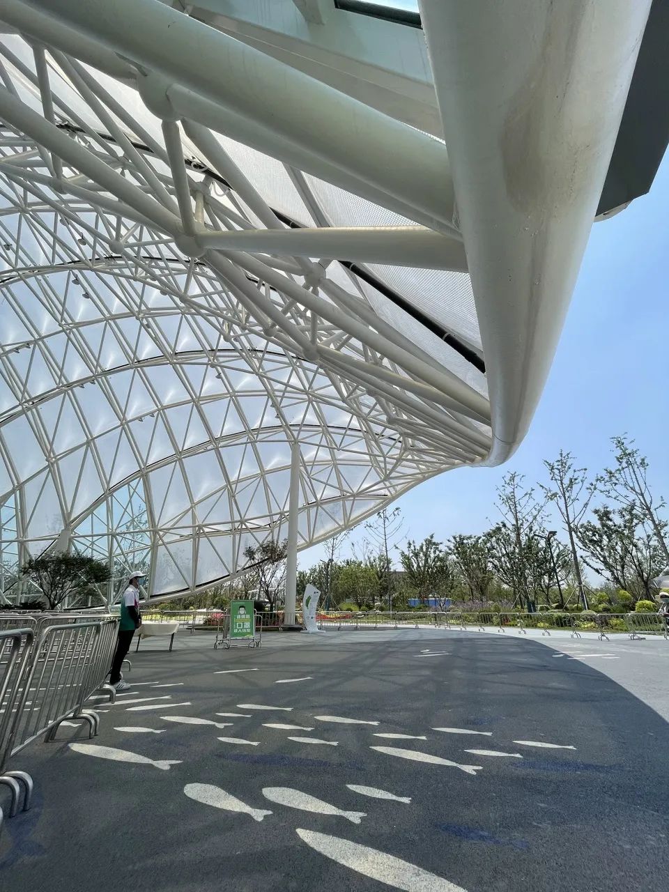 设计的主体立意源自长江中的“大熊猫”——江豚,通过模仿生物形态化的语言,将江海文化表现的淋漓尽致。总体布局遵循“虚实相生,内外一体”的思想,建筑造型喻意“江豚游弋”,是对地域与文化特征的概况提炼,以形表意,融于自然。外部景观设计中以海浪形态的铺装、飘摇水草形态的遮阴构筑、鱼形景观铺装及小品渲染烘托江海之恋的设计主题,最终呈现以江海文化为主要特色的整体景观风貌。表现出生态绿色,融入自然的整体形象,突显自然、人文、生态的主题。▲“江豚”建筑与“海豚”景观 © 南京长江都市建筑设计股份有限公司▲建筑与景观融合呼应 © 南京长江都市建筑设计股份有限公司我们将“江豚”的形体进行拓扑变形,并且为这座展馆设计了一层机具柔性的外壳,围合出一个有张有弛的展示空间。有着朦胧感的ETFE膜作为项目外围护的主要材料,记叙着如今仪征市高歌猛进的时代性;柔韧的造型,阳光照射下的漫反射光感不难让人联想到“江豚时出戏,惊波忽荡漾”的场景,现代性与在地性于此间寻求平衡,在城市文脉的彼此关照中成为可阅读、可识别的事物。▲“波光粼粼”的柔性外壳 © 南京长江都市建筑设计股份有限公司结构受力件与建筑赋形融合考虑,将美学趣味和建构观念的矛盾藏匿在了作品的建成效果中。展馆立面肌理与结构形式结合,形成交错的井字型框架,其间填充ETFE膜作为建筑的外围护。根据网壳结构的特点,表皮被划分成约16㎡/个的许多菱形单元,ETFE膜气枕单元和玻璃单元依建筑功能交错布置,立面上形成有趣的肌理变化。▲ETFE气枕膜表皮 © 南京长江都市建筑设计股份有限公司▲ETFE膜和玻璃交错布置 © 南京长江都市建筑设计股份有限公司热带植物温室不同于常规的展览建筑,植物生长环境对光照度、温湿度等都有特殊的要求。在建筑顶部,我们设置了可开启的膜气枕单元,在炎热的季节,通过电动控制打开顶部气枕,有助于热空气的排出,改善室内空气质量。在空调设计中,针对大空间特点,空调末端采用岛式空调机组,展览厅的幕墙四周设立式暗装风机盘管,设置于地沟内,最大程度地保证了空间通透的效果和室内环境的舒适度。▲室内环境优化分析 © 南京长江都市建筑设计股份有限公司▲ ETFE气枕开启节点 © 法尔福空间结构(上海)有限公司▲一层平面图 © 南京长江都市建筑设计股份有限公司▲建筑单体立面1 © 南京长江都市建筑设计股份有限公司▲建筑单体立面2 © 南京长江都市建筑设计股份有限公司项目名称:扬州世界园艺博览会国际馆