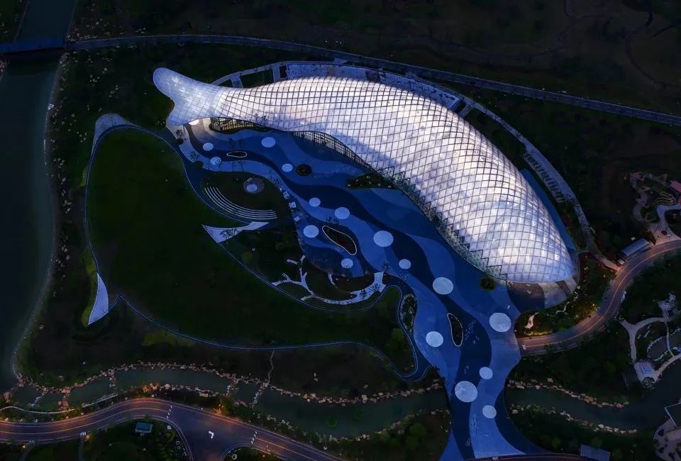 设计的主体立意源自长江中的“大熊猫”——江豚,通过模仿生物形态化的语言,将江海文化表现的淋漓尽致。总体布局遵循“虚实相生,内外一体”的思想,建筑造型喻意“江豚游弋”,是对地域与文化特征的概况提炼,以形表意,融于自然。外部景观设计中以海浪形态的铺装、飘摇水草形态的遮阴构筑、鱼形景观铺装及小品渲染烘托江海之恋的设计主题,最终呈现以江海文化为主要特色的整体景观风貌。表现出生态绿色,融入自然的整体形象,突显自然、人文、生态的主题。