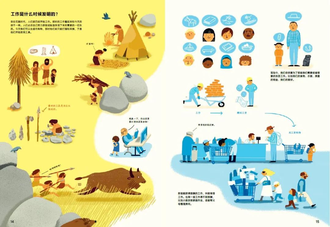 这是一本适合5-9岁孩子阅读的通识百科类图文书,获得2022年德国EMYS年度非虚构图书大奖。作品用16个跨页大图从孩子们能看到的日常生活逐渐深入,探索关于“工作”的方方面面,通过精美的图文让“工作”不再只是一个抽象的概念,一个敷衍孩子的说辞,例如:重要的工作都能赚大钱吗?工作会灭绝吗?每个人都有工作吗?