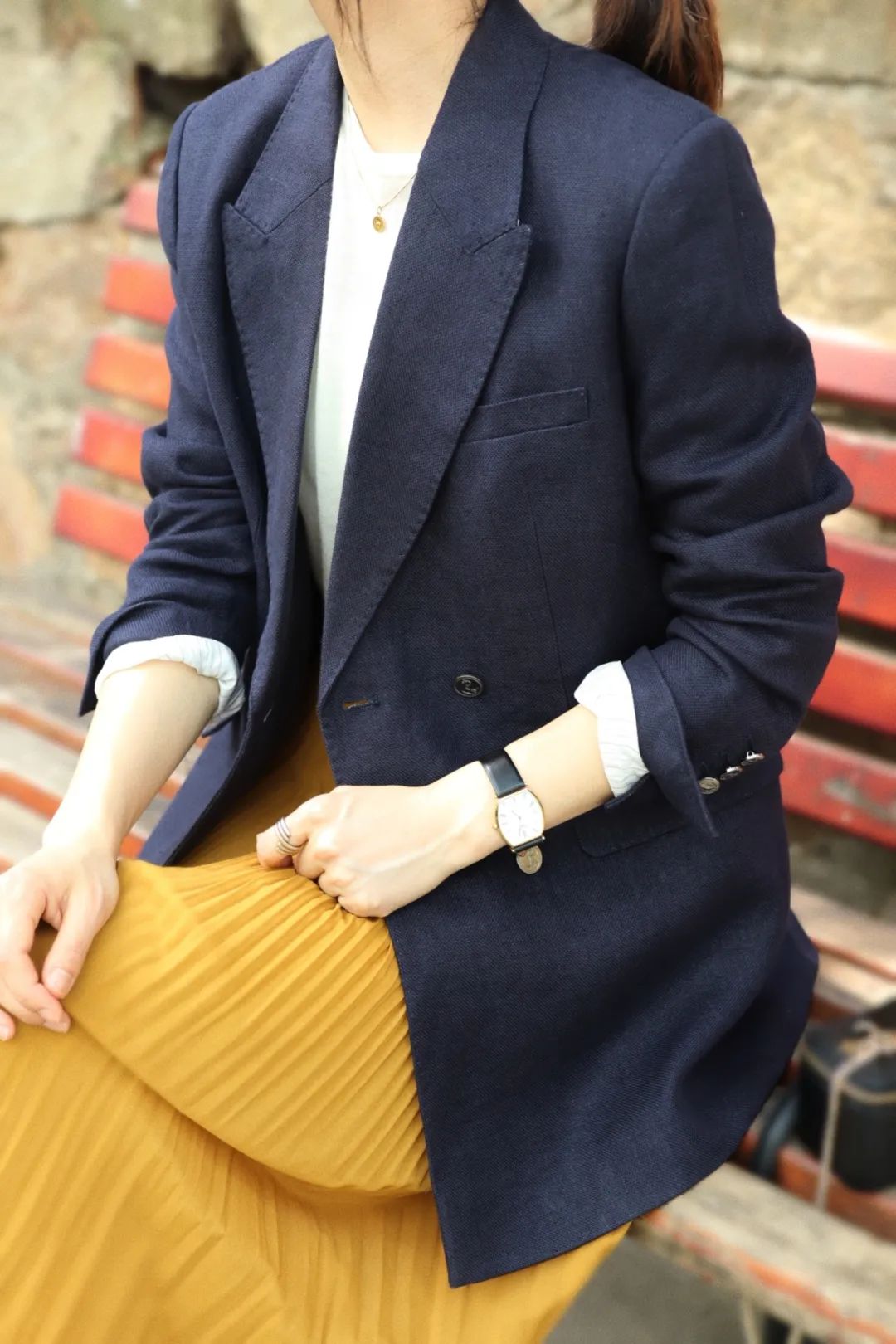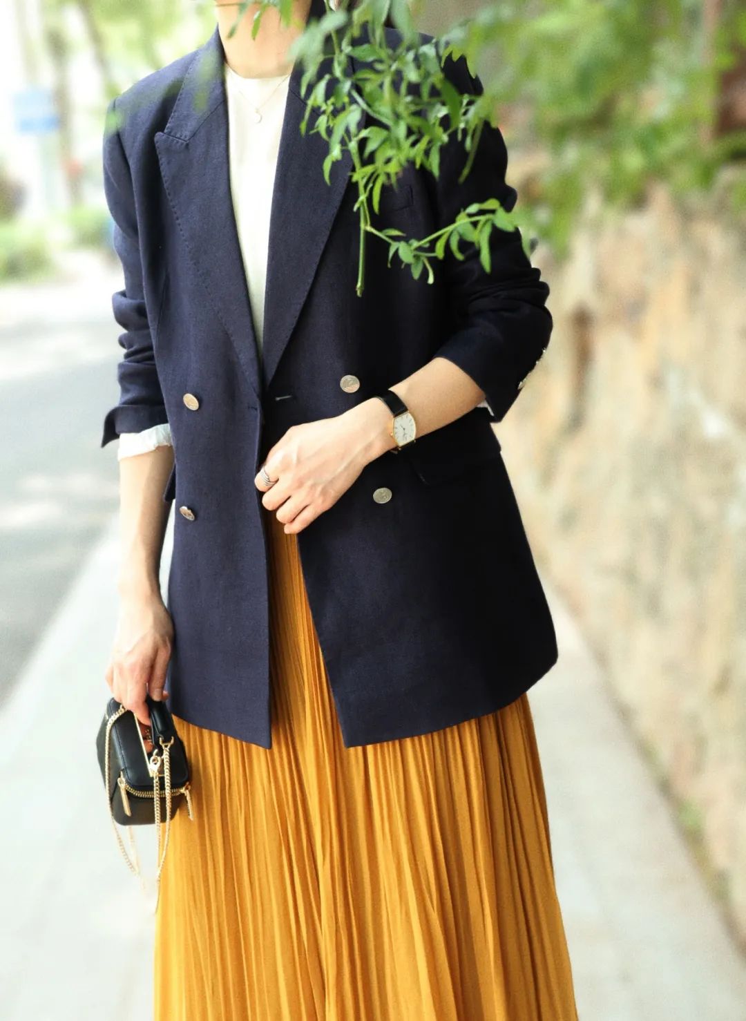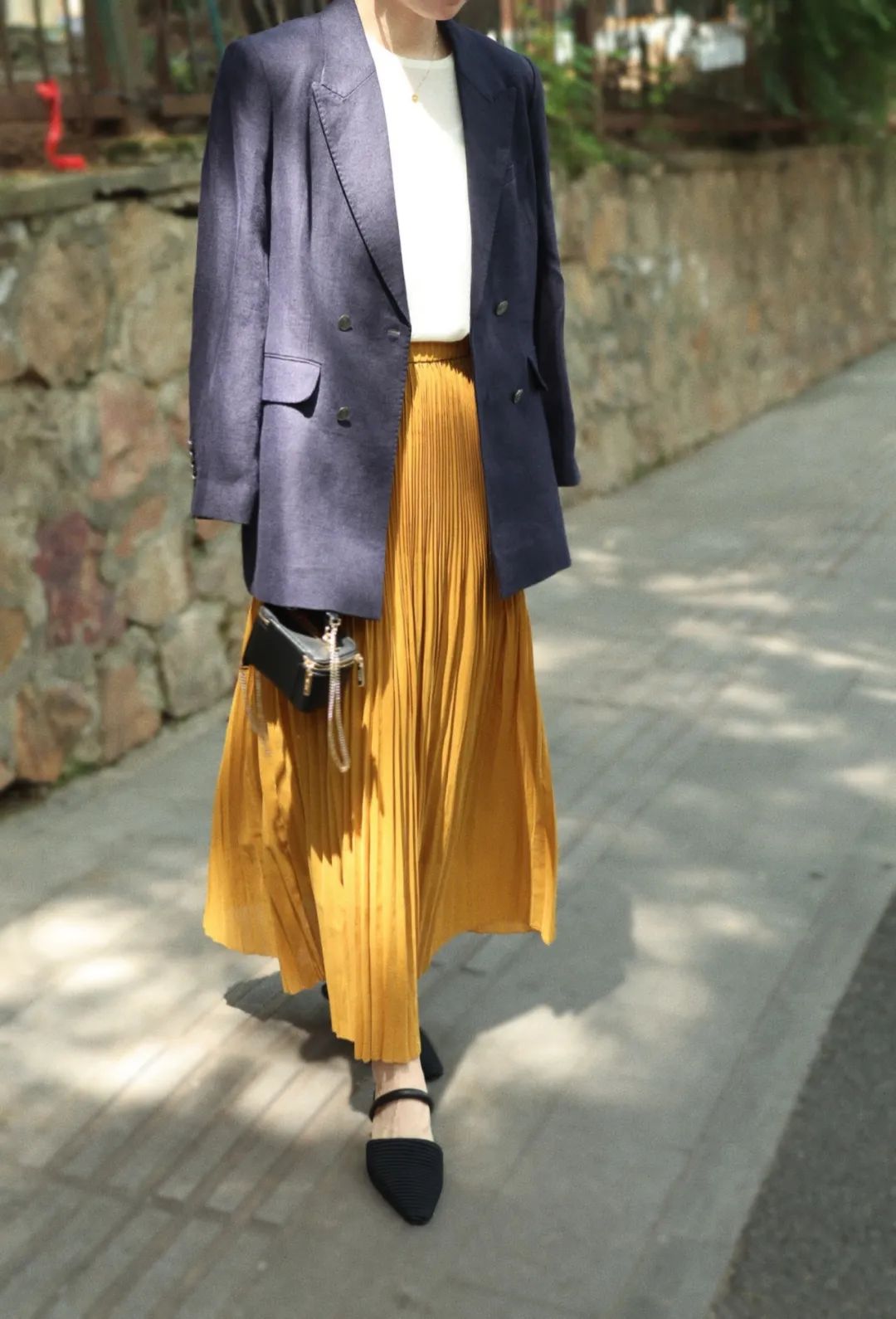 丈青色搭配饱和度高的黄色半裙