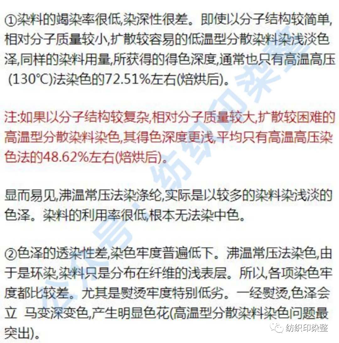 (1)沸温常压染色的缺点。沸温常压染色法是在不施加载体的条件下,沸温100℃染色。因此,与沸温载体染色法是两个不同的概念。