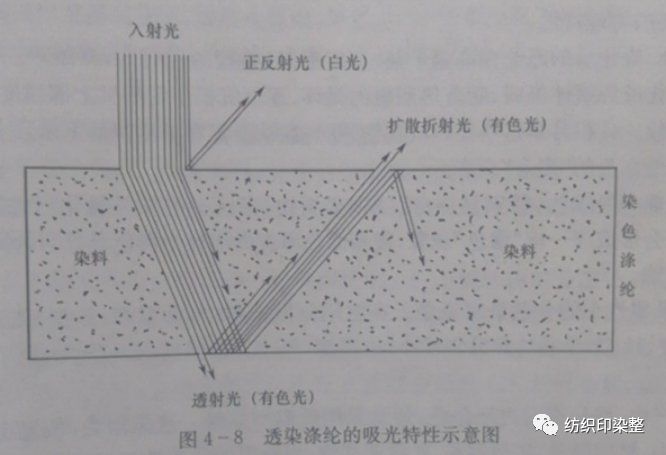 当光从上方入射,部分光在纤维表面发生正反射,呈现出白光。部分光折射进入纤维内部。 其中,部分光被染料部分吸收后,成为透射光,以有色光出现。其余光在纤维内反复扩散、折射,并不断被染吸收。