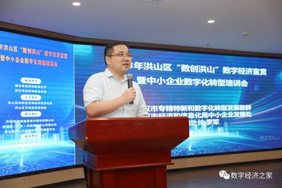 武汉市中小中心副主任程博对《武汉市专精特新和数字化转型相关政策》进行宣贯。程主任解读了专精特新、揭榜挂帅、示范城市等方面的政策,为洪山区中小型企业数字化转型指明了方向。
