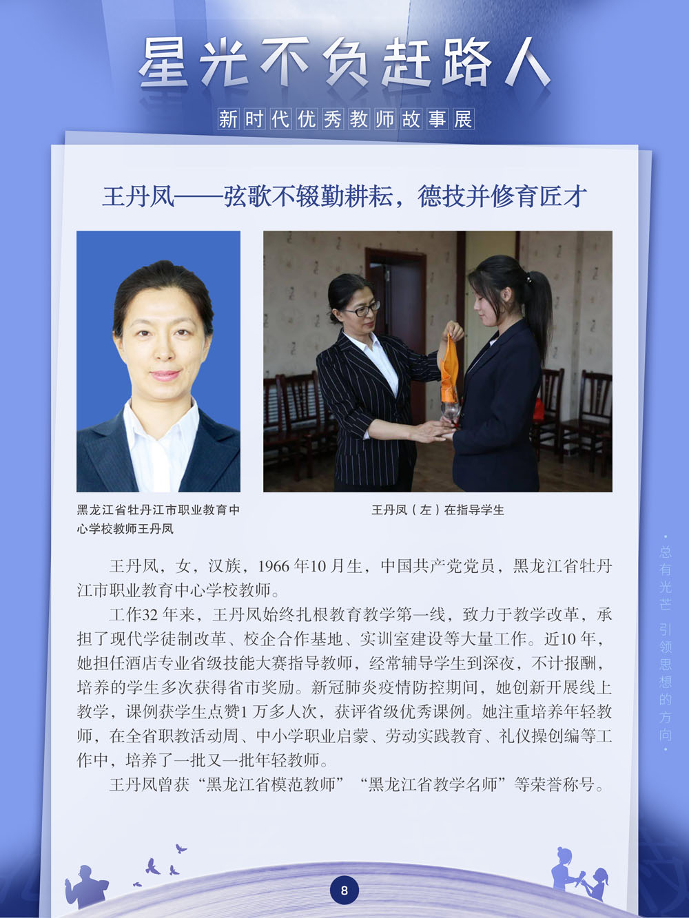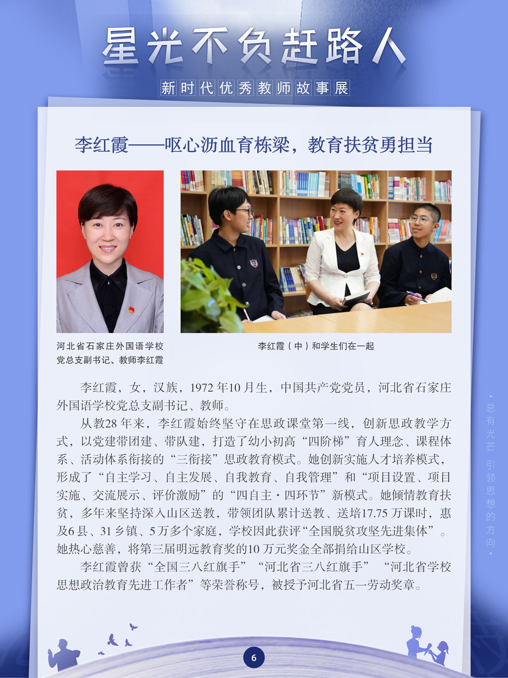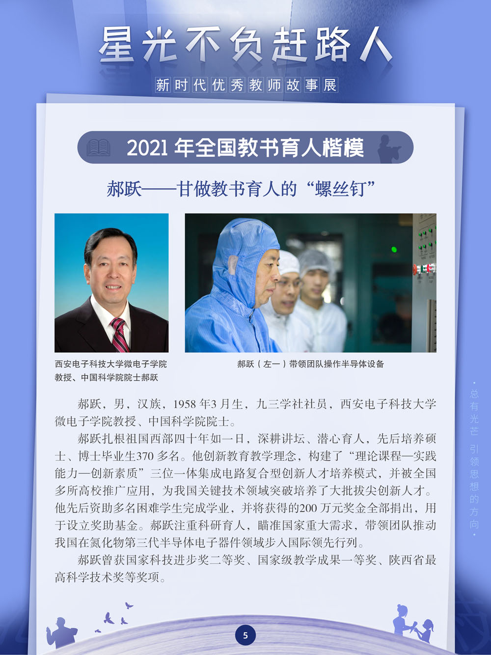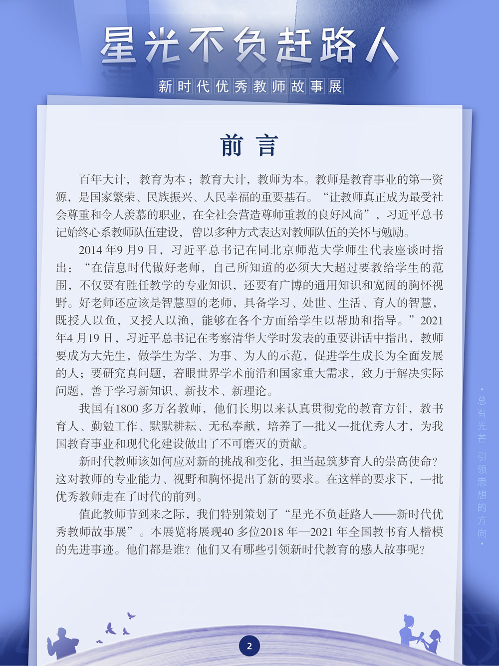 ![]() zhōng 中 guó 国 jiāo 教 shī 师 jiē 节 2023年9月10日 星期日 总有人说,教师是这世界上最崇高的职业,因为他们肩负起了锻造国家栋梁的重任。新时代教师该如何应对新的挑战和变化,担当起筑梦育人的崇高使命?这对教师的专业能力、视野和胸怀提出了新的要求。在这样的要求下,一批优秀教师走在了时代的前列。值此教师节到来之际,我们特别策划了“星光不负赶路人——新时代优秀教师故事展”。本展览将展现40多位全国教书育人楷模的先进事迹。他们都是谁?他们又有哪些引领新时代教育的感人故事呢? | ||