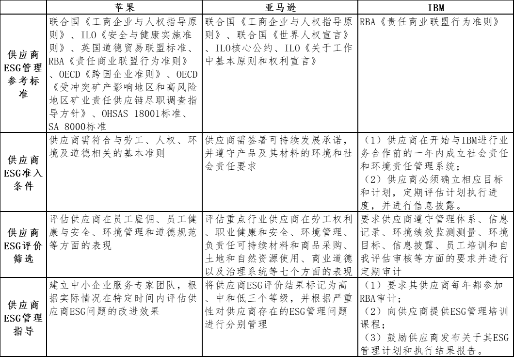 从供应商ESG准入条件看,三家案例企业均要求供应商满足其最低门槛的ESG管理要求,但执行方式各有不同。亚马逊要求供应商签署可持续发展承诺,IBM要求企业建立社会和环境相关管理系统,制定可持续发展管理目标和计划并定期披露其执行情况。
