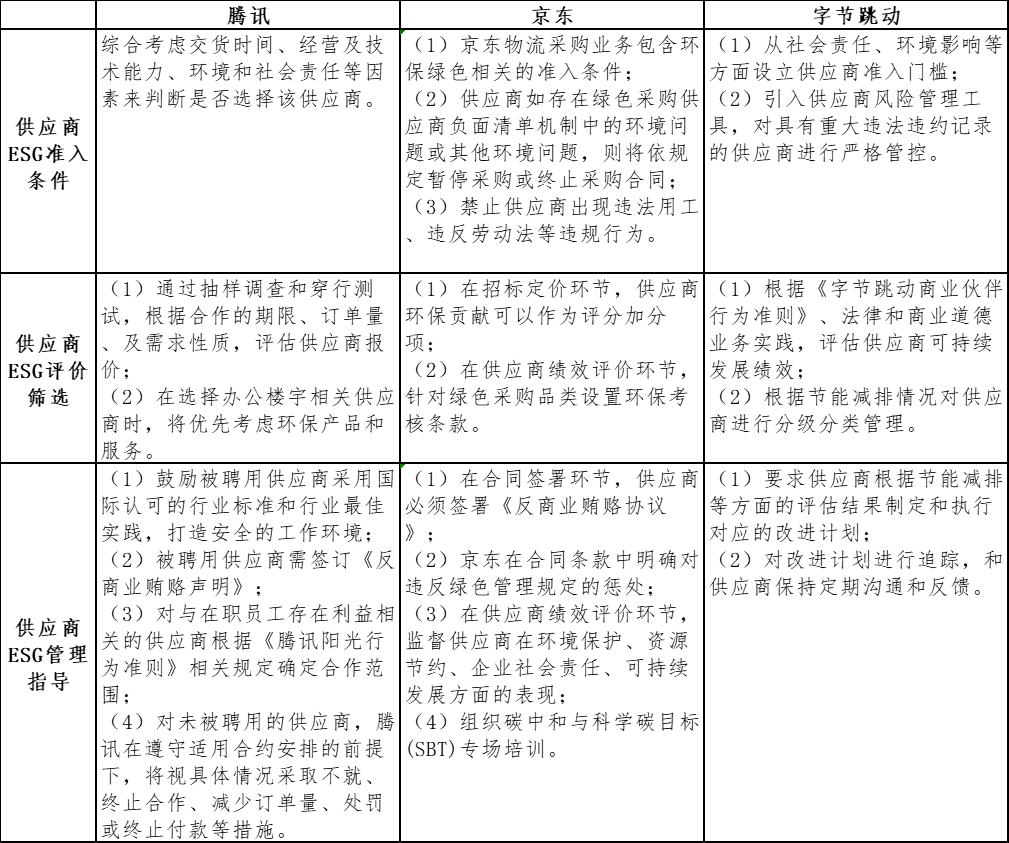 在供应商ESG准入条件方面,在京东自2020年起制定绿色采购管理规定,将环保绿色理念融入京东物流的采购业务。同时,京东建立了绿色采购供应商负面清单机制。进入绿色采购供应商资源管理库的供应商若出现负面清单中所列情形或其他环境问题,京东将依规定暂停采购或终止采购合同。此外,京东声明禁止合作供应商出现违法用工、违反劳动法等违规行为,情节严重的进行黑名单管理,列为京东的永不合作供应商。在供应商ESG评价筛选方面,京东在不同采购环节采取了不同的ESG管理措施。在招标定价环节,供应商的环保贡献可以作为评分项目中的加分项。在供应商绩效评价环节,京东会针对绿色采购品类设置相应的环保考核条款。