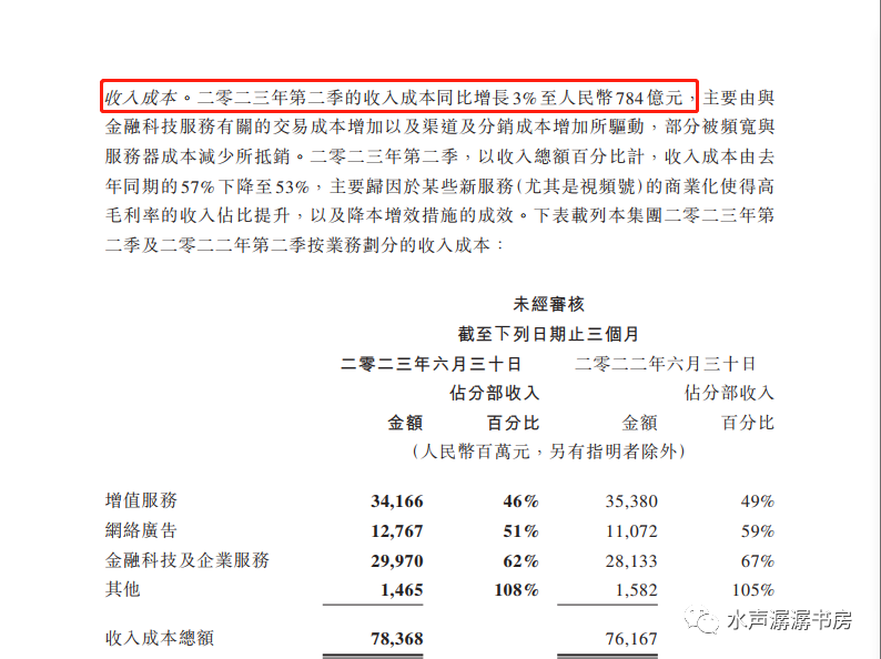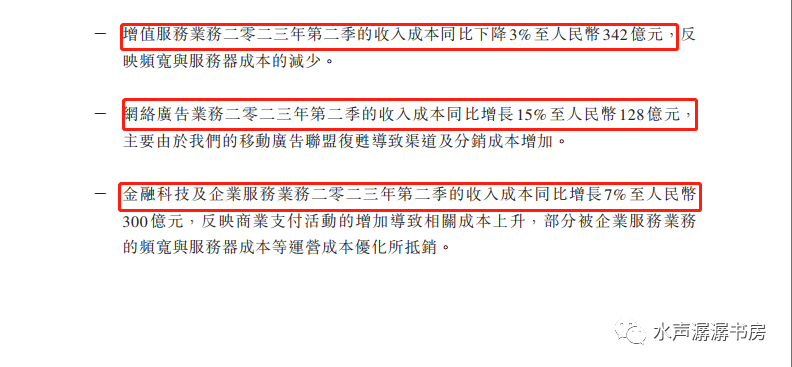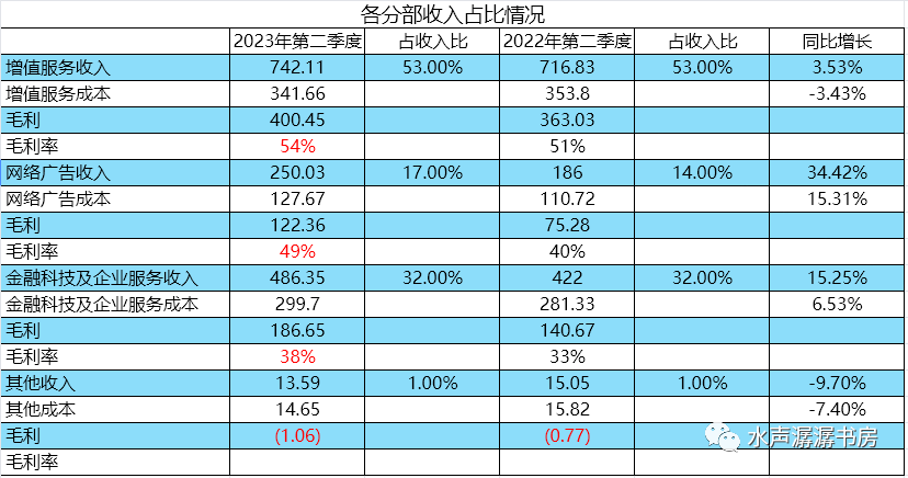 从上表可以看出:增值服务收入同比增长 3.53%、成本同比下降 3.43%,成本增长速度小于收入增长速度,那必然导致毛利率上升,表中显示毛利率从 51%上升到 54%;网络广告收入同比增长 34.42%、成本同比增长 15.31%,成本增长速度远小于收入增长速度,那必然导致毛利率上升,表中显示毛利率从 40%上升到 49%;金融科技及企业服务收入同比增长 15.25%、成本同比增长 6.53%,成本增长速度远小于收入增长速度,那必然导致毛利率上升,表中显示毛利率从 33%上升到 38%;其他收入虽然目前仍处于亏损状态,但因占比较小,只有 1%,对毛利率的影响可以忽略不计。