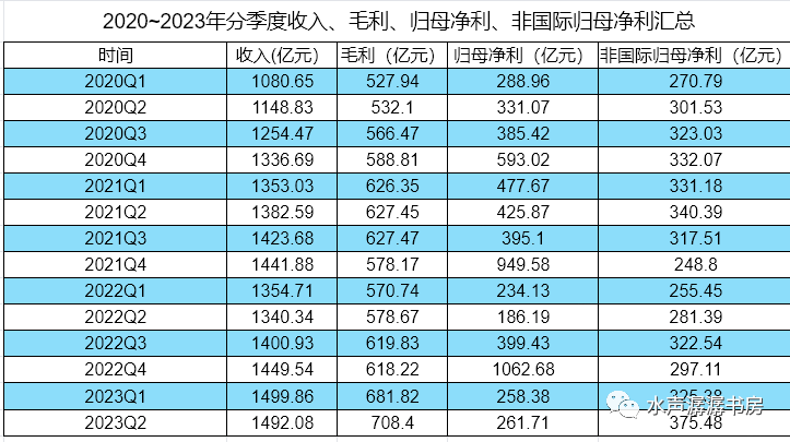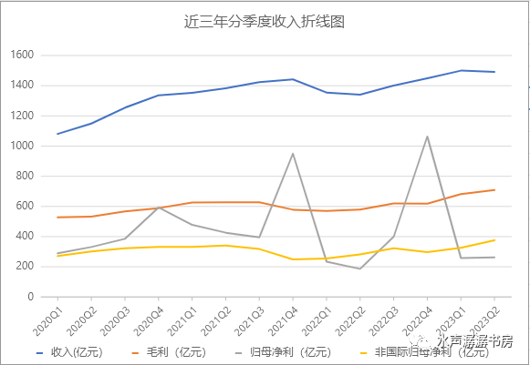 从上表(图)可以清晰看出,收入比 2023 年一季度少 7 亿元,处于近三年来的历史第二高位;毛利及非国际归母净利处于近三年来最高位;由于归母净利受投资收益影响较大,近三年来出现较大幅度的波动,我们暂且不予关注。
