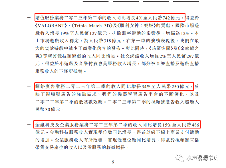 c、2023 年第二季度金融科技及企业服务收入同比增长 15%,金融科技服务收入得益于线上线下商业支付活动的增加;企业服务收入有所改善,得益于视频号直播带货交易产生的收入。云服务是轻微增长。