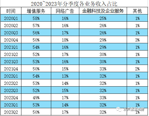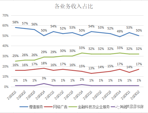 增值服务占收入比从 2020 年第一季度高点 58%逐年下滑到 2023 年第二季度的 50%;网络广告占收入比距离 2020 年第四季度高点 18%还有一步之遥;金融科技及企业服务占收入比从 2020 年第一季度的 25%,持续稳定地上升到 32%;其他占收入比一直在 1%。