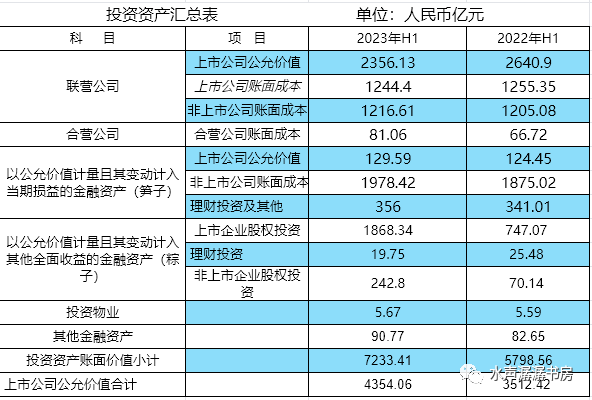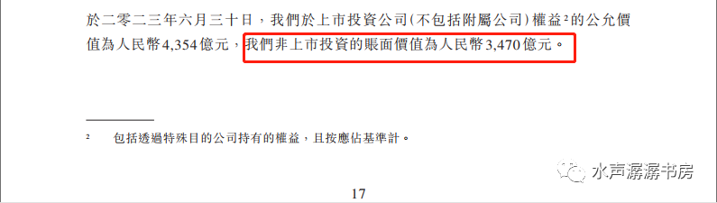 数据很清晰,可以看做公司用负债总额 6966.87 亿(3871.5+3095.37=6966.87),对应做了投资。上市公司公允价值7233.41亿,非上市公司账面成本为3518亿(1216.61+1978.42+242.8+81.06=3518),在财报第17页,列示的非上市投资的账面价值为3470亿(见下图)。