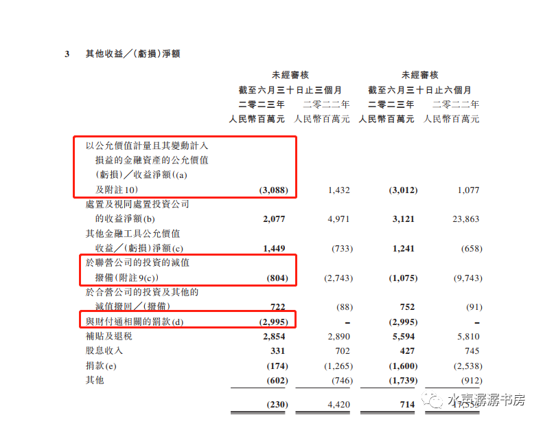 前二季度挣钱部分包括:处置及视同处置收益 31.21 亿,其他金融工具公允价值变动收益 12.41 亿,补贴退税 55.94 亿。亏损的部分包括:笋子的公允价值变动亏损 30.12 亿,联营公司减值损失 10.75 亿,财付通罚款 29.95 亿。