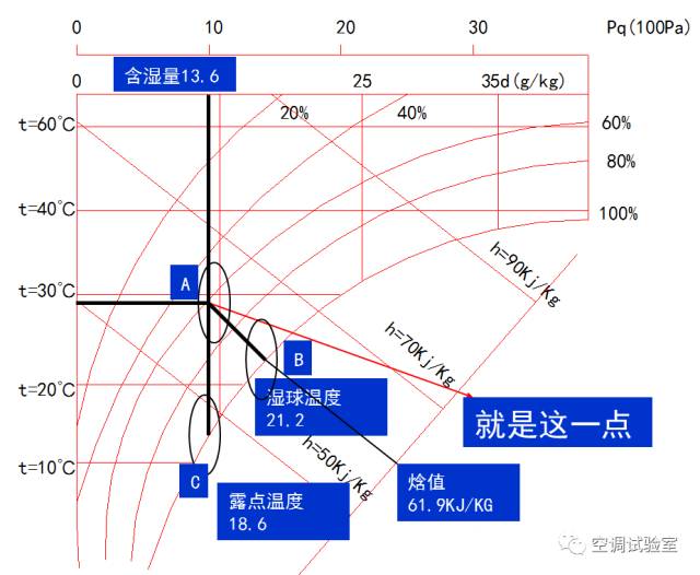 1)在焓湿图上找到30℃等温线与60%等相对湿度线的交点A。