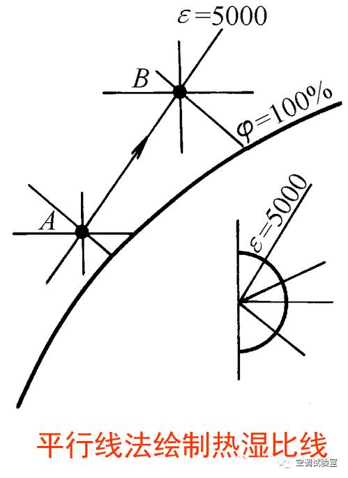 根据直线斜率的特性,在焓湿图上以任意点为中心作出一系列不同值的ε标尺线,实际应用时,只需把等值的ε标尺线平移到空气状态点,就可画出该空气状态的变化过程线了。该作法称为平行线法(参见下图)。