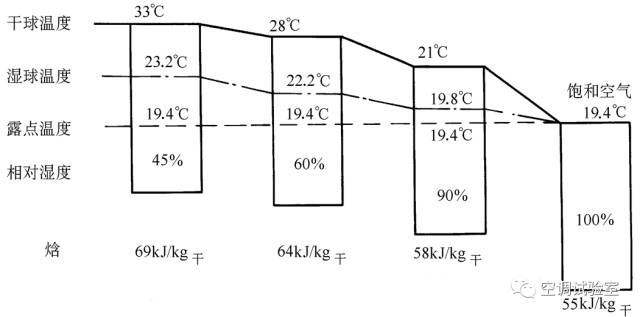 例:考察一个等湿降温过程,设空气初状态的干球温度为33℃,含湿量为14g/kg干。查焓湿图,求当空气终状态的干球温度分别为33℃、28℃、21℃和19.4℃时,相应的湿球温度、露点温度、相对湿度和焓。