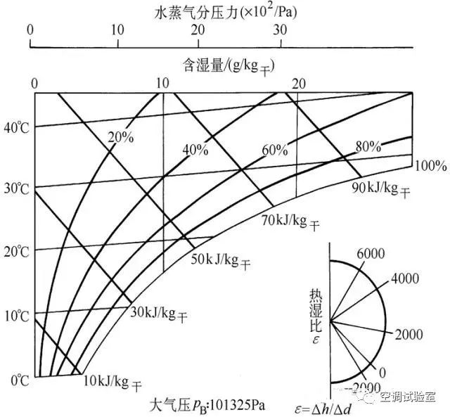 为了说明空气状态变化的方向和特征,常用空气状态变化前后的焓差Δh和含湿量差Δd的比值来表示。这个比值称为热湿比ε(单位为kJ/kg) ,也称为角系数,即: